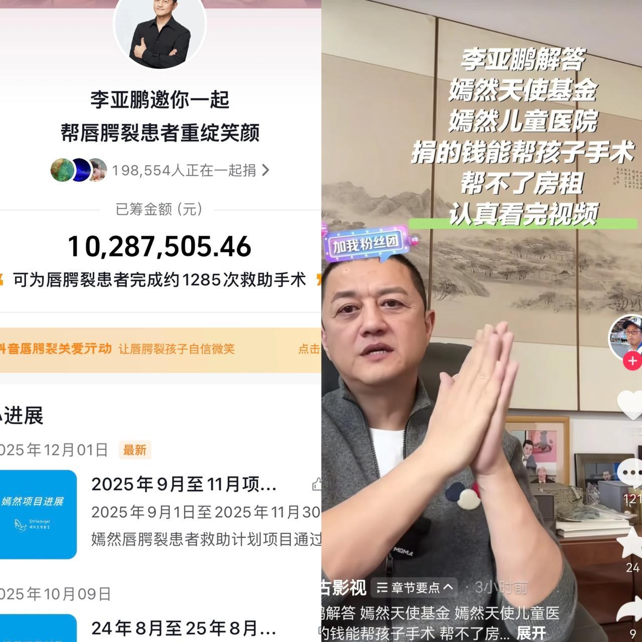 李亚鹏直播那天我看了! 礼物刷得那叫一个满天飞。 他下播时候说了一句:后面 算出来,替大家捐了。 其实了解过嫣然医院的都知道,李亚鹏这十几年是真在往里贴钱。他自己聊起来,说因为自己女儿,这事必须做好。 前十年医院员工的运营开销,都没动用捐款,是他自己想法子。后来生意上遇了难处,也是靠朋友帮衬才撑住。这么一看,这人除了不会做生意,做人是没问题的。 嫣然儿童医院厉害在哪? 它很“专”,只攻唇腭裂这一项,做到了亚洲顶尖。它是全亚洲第一家通过JCI认证的民办儿童医院,这标准在国际上就是金字招牌,意味着服务和安全都拔尖儿。 孩子从3个月大到18岁,手术、正畸、语言心理辅导一条龙。 累计1.1万台手术,七千多例是给贫困家庭免费做的,连患者家属的吃喝路费都常给报销。 说实话,半年前就陆续有早年接触过他的圈内人出来说话,说李亚鹏为人不错,也没什么黑料。 如今看来,这种口碑“反转”从来不是偶然,是十几年埋头做好一件事,时间到了,大家自然都看见了。 做慈善不难,难的是静下心,把一件专业的事做到极致,而且不忘初心! 大家怎么看李亚鹏?