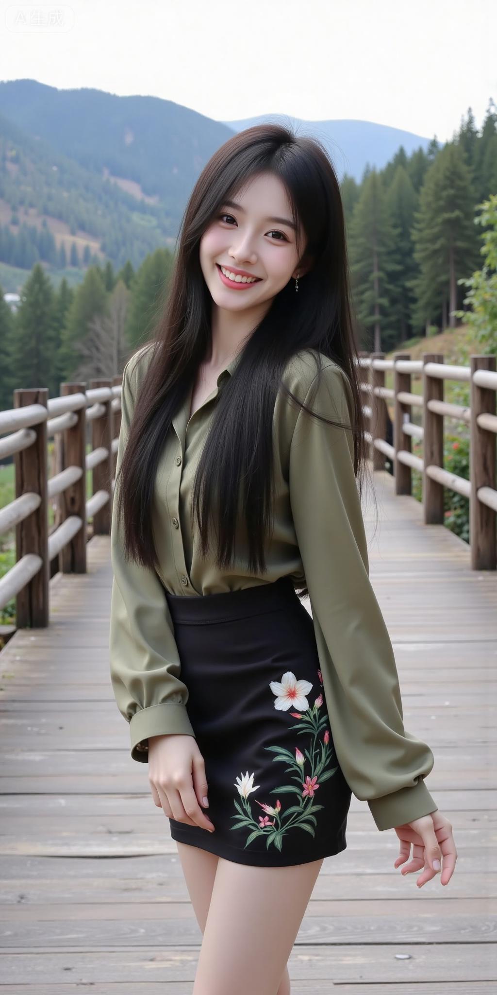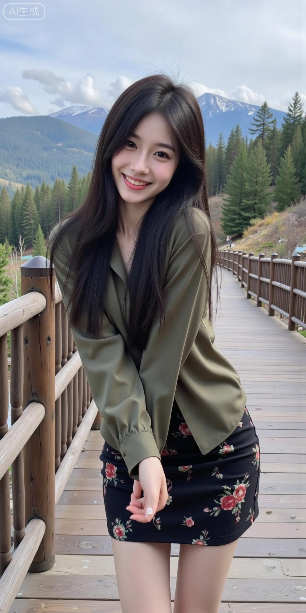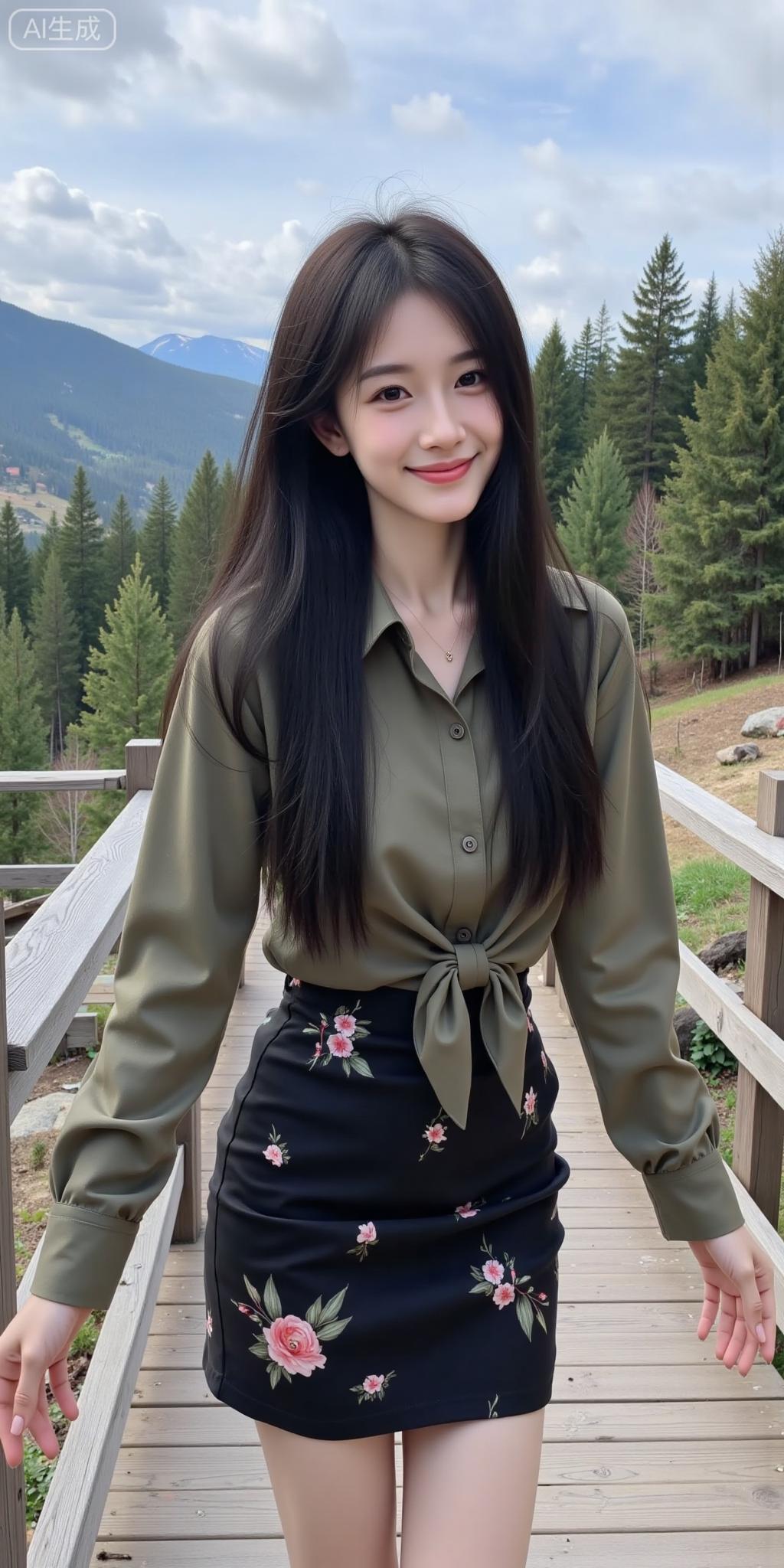 山林栈道的温柔系少女 橄榄绿衬衫裹着松弛感,黑裙的玫瑰印花添了点柔媚~连远山雪顶和松林都成了她的治愈背景板✨ 是把“自然松弛感”焊在身上的妹妹!