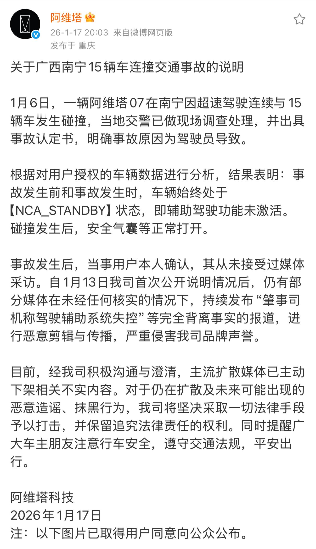阿维塔就南宁15车连撞事故发声明,交警认定是驾驶员超速导致,车辆数据显示事故前后辅助驾驶都没激活,气囊也正常弹出。针对部分媒体传“辅助驾驶失控”的不实内容,阿维塔已推动下架并将追责。不得不说,有些媒体为了博取流量,越来越没底线了!
