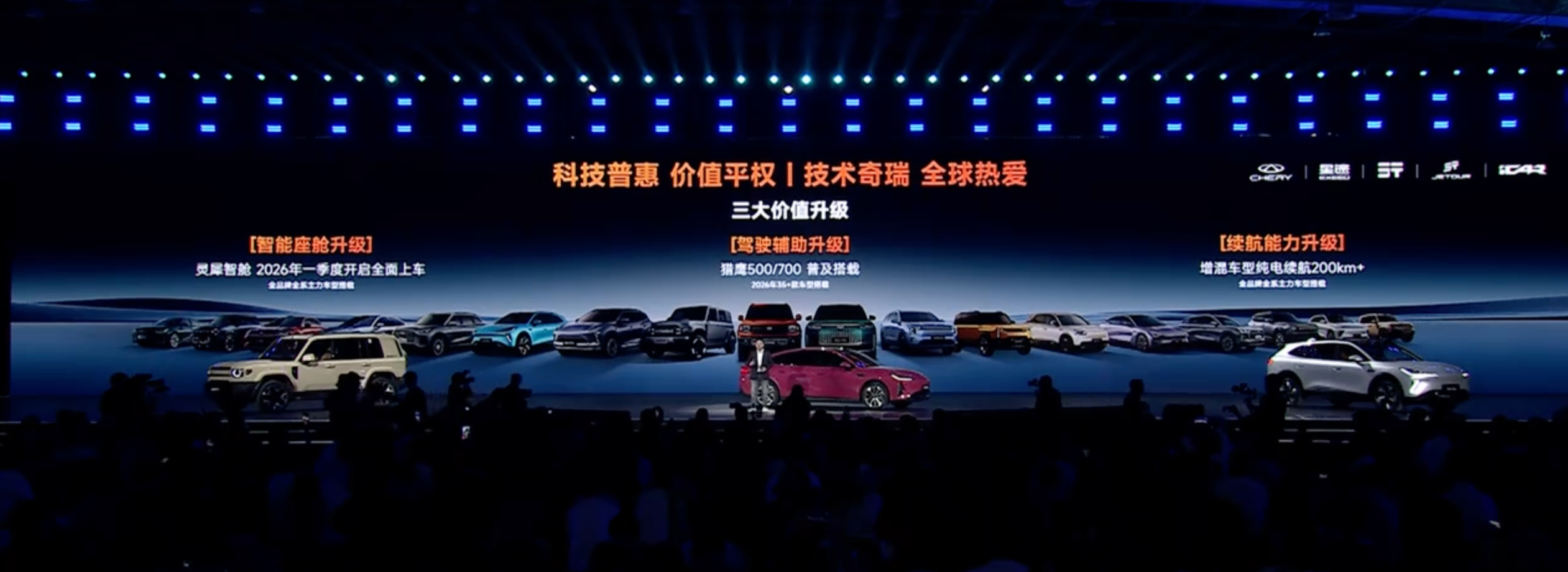 奇瑞集团今年也要科技普惠 价值平权,2026年奇瑞集团将有超过35款车型搭载猎鹰智驾,猎鹰智驾分为猎鹰500、猎鹰700和猎鹰900三种方案,猎鹰500就搭载端到端城区导航辅助驾驶 。此外奇瑞的智能座舱今年也将升级,灵犀座舱将在2026年一季度开启全面上车,全品牌全系主力车型搭载 科技有ai 2026奇瑞汽车ai之夜