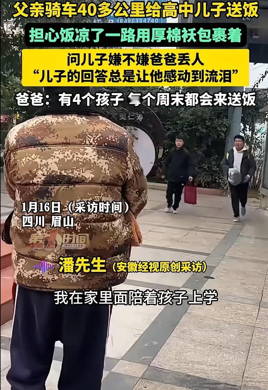 看着看着眼泪也就跟着下来了! 四川一位父亲每周日骑40里路给高校的儿子送饭,问出那句话后低头哭了! 四川眉山的潘先生每周日下午都会骑自行车出门,车篮里总有个用棉被和旧衣服裹得严严实实的大锅——里面是他刚做好的热饭菜。他得骑四十多公里,送到县城高中,给两个住校的儿子。 学校周日晚上没饭,这事成了父亲心里的结。他特意在家附近打零工,就为周末能给孩子们做顿热乎的。饭菜装锅,裹紧棉被,旧自行车蹬起来。路上就一个念头:别凉了。 但每次到了学校门口,看着周围来往的家长和学生,他心里会咯噔一下。自己穿着洗旧的工装,推着叮当响的自行车,抱着个用破棉被包着的锅,站在那儿特别扎眼,他怕儿子尴尬。 有一回送完饭,他像是随口问小儿子:“爸这样来……嫌不嫌丢人啊?”儿子正扒拉着热饭菜,头也没抬的说:“没觉得丢人啊,这样很好啊,很满足。” 就这么句话,让这个父亲扭过头,眼泪一下子出来了。 这段看的我眼泪都下来了,现在很多父母都这样,爱得小心翼翼。 他们不怕累,骑四十公里算什么;怕的是自己不够“体面”,给孩子“丢面子”。那种捧出全部真心,还担心对方嫌土的心情。可孩子往往比我们想的更通透——他们眼里哪有什么寒碜不寒碜,只有“我爸给我送热饭来了”。 这件事情让我想起我上学那会,我妈总用红色塑料袋给我装水果,我一度觉得土。 但现在回想,那塑料袋鲜红鲜红的,在宿舍一堆零食里,格外的亮眼,格外的温暖! 你有没有那么一刻,突然理解了父母那种“笨拙”的付出?或者说,你见过哪些“不体面”却沉甸甸的爱?