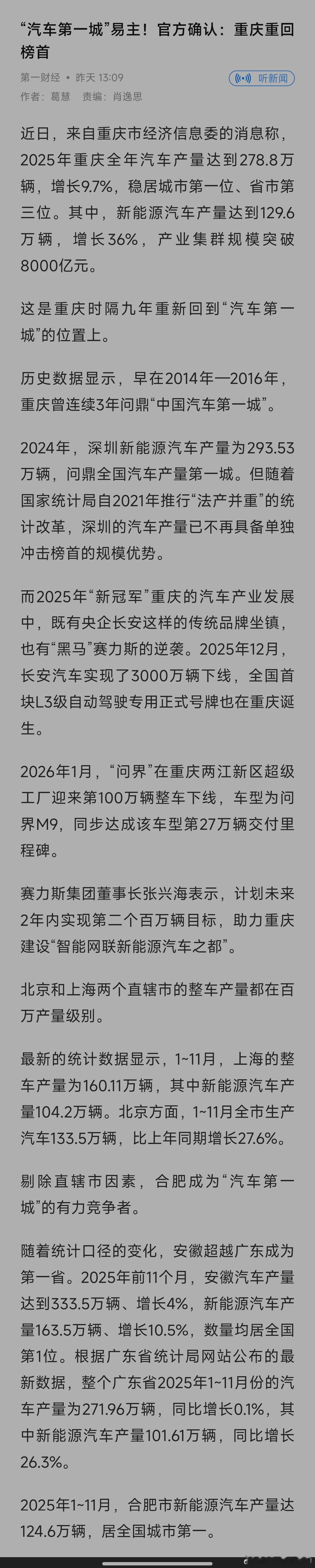 汽车第一城易主有谁知道【吉林长春】霸榜中国汽车第一城30余年从1956年直到2014年被重庆超越2014-2016年重庆连续3年第一2017-2023年广州连续7年第一2024年深圳登顶2025年重庆重回第一中国汽车第一城易主
