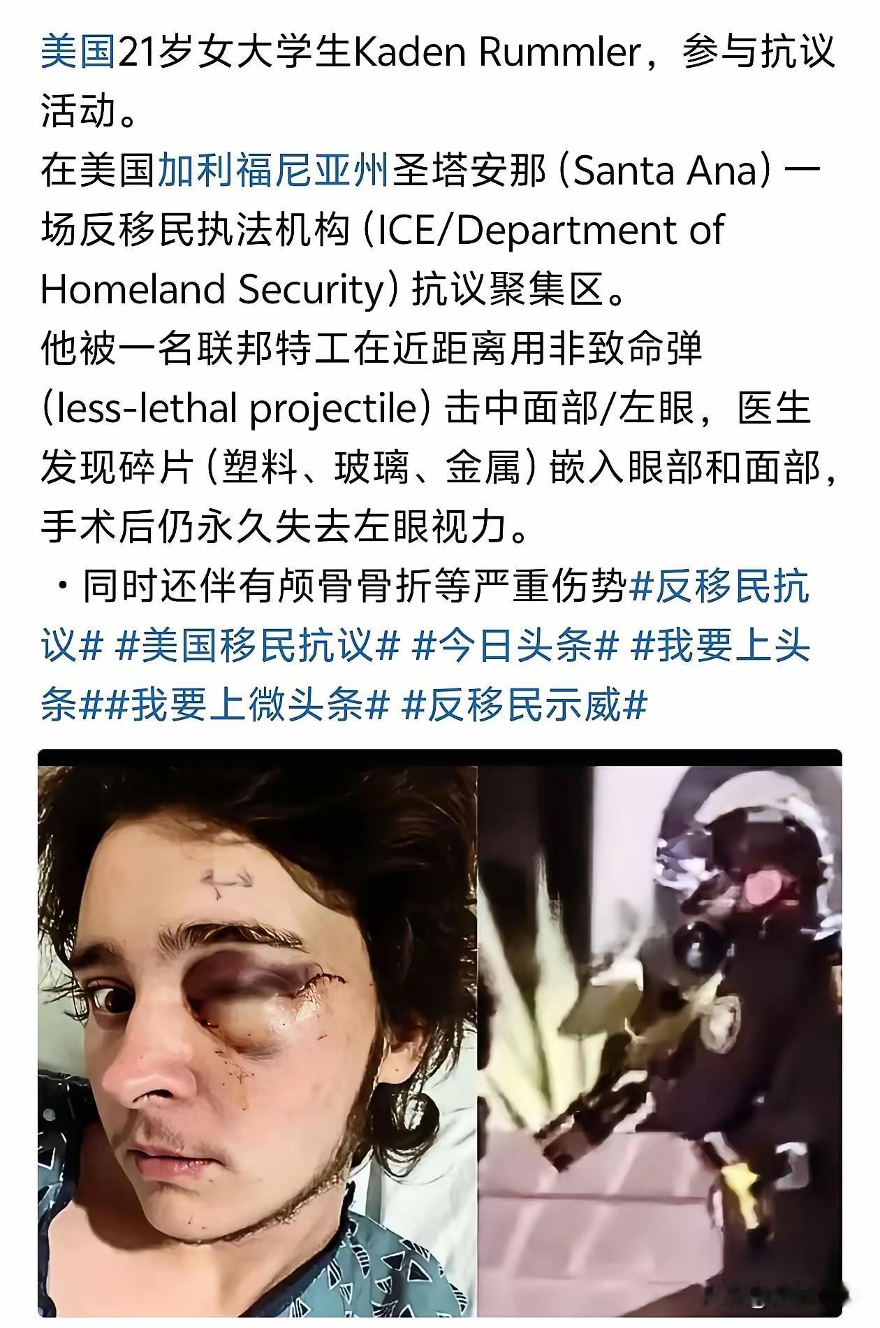 大漂亮大学生参加抗议活动,结果眼睛被特工打成了这个样子,看来伤的不轻,大漂亮的特工下手太重了!