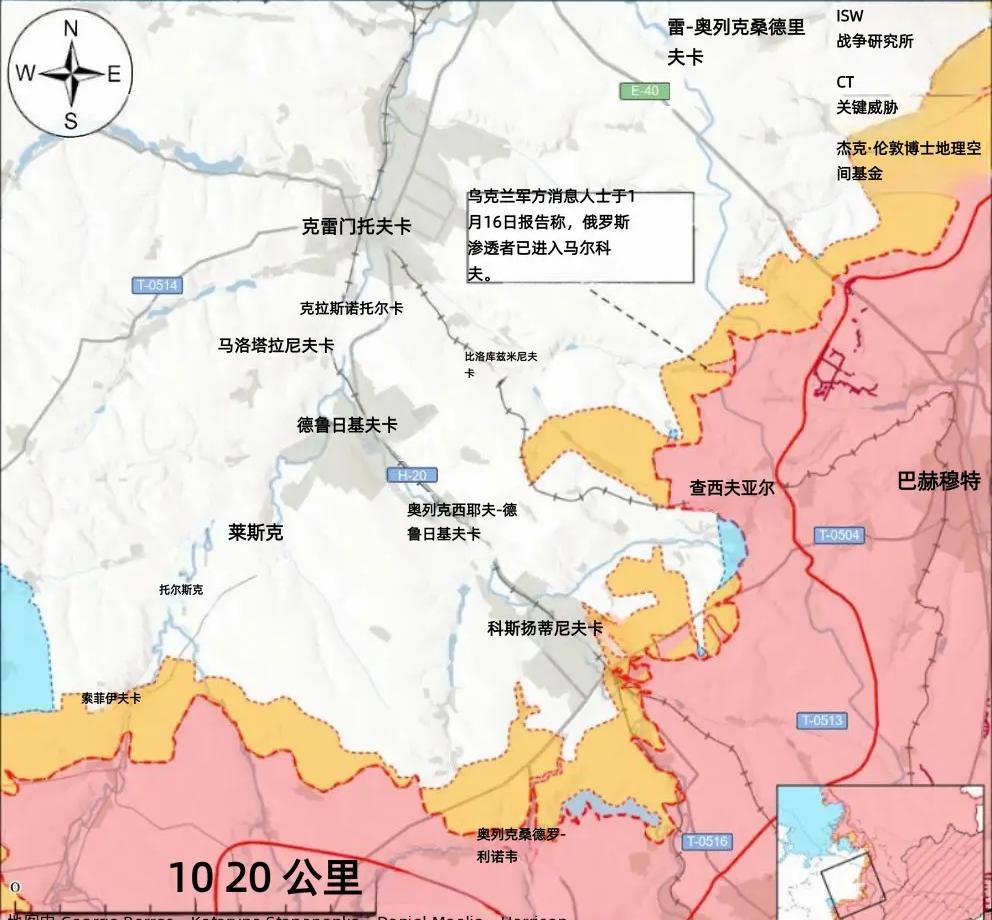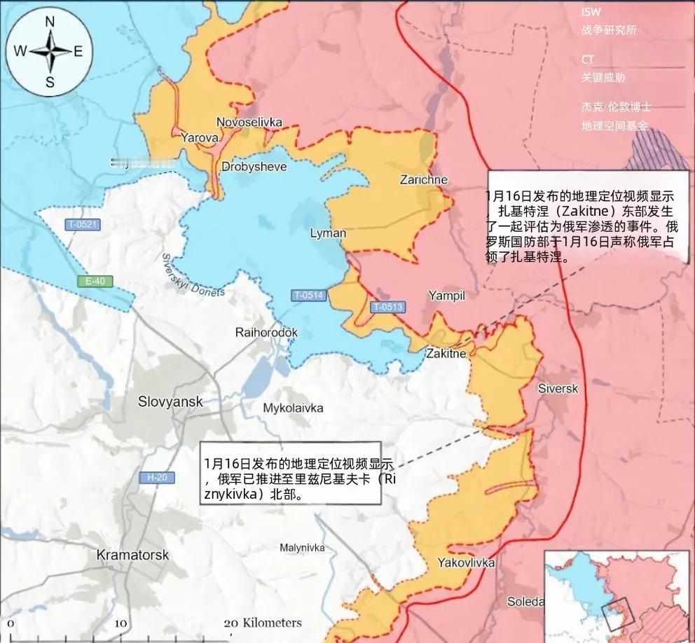 决战双子城之外围争夺:俄军在斯拉维扬斯克和康斯坦丁诺夫卡取得进展 1月16日发布的地理定位视频显示,俄军已在斯拉维扬斯克以东的里兹尼基夫卡以北区域取得推进,这是俄军在该方向近期最明确的战线前移动作。 俄国防部于1月16日宣布,俄第7摩托化步兵旅(隶属南部军区第3合成集团军,前身为卢甘斯克人民军第2军)部队已攻占扎基特内;俄军事博主透露,扎基特内城内仍有持续交火,双方控制权尚未明朗。 1月15日至16日,俄军在斯拉维扬斯克及周边展开全域攻势:东北方向针对德罗尼夫卡、普拉托尼夫卡、扎基特内发起冲击;东部方向集中兵力在锡韦尔斯克、里兹尼基夫卡一线进攻;东南方向则向拉伊-亚历山德里夫卡、尼基福罗夫卡、圣波克罗夫斯克、帕泽诺等地发起攻击。乌军方面则有军事博主称,乌军已在奥泽尔内、圣波克罗夫斯克附近组织反击,遏制俄军进一步推进势头。 战场战术层面,据斯拉维扬斯克方向乌军某旅高级士官透露,俄军近期显著提升侦察无人机使用频次,但暂未投入重型装备作战;俄军正持续向锡韦尔斯克集结兵力,不过锡韦尔斯克低地地形对乌军有利,可依托地形优势打击俄军兵力集结点。另有俄军事博主消息,俄军已打击莱曼以西马拉基、莱曼西北博霍罗迪奇内附近的北顿涅茨河渡口,意图切断乌军补给线与机动通道。 兵力部署上,俄军在该方向以无人机作战为核心:第3合成集团军第123摩托化步兵旅无人机操作员,重点打击斯拉维扬斯克以东卡列尼基、里兹尼基夫卡以南的乌军车辆;中央军区第25合成集团军第67摩托化步兵师第37摩托化步兵团的FPV无人机操作员,在莱曼地区执行乌军车辆打击任务;鲁比孔先进无人技术中心无人机分队则在莱曼方向全域展开作战。 作为克拉马托尔斯克南侧关键屏障,康斯坦丁诺夫卡方向俄军渗透与攻势同步推进,战场压力持续攀升。1月16日,克拉马托尔斯克方向乌军某旅发言人证实,俄军渗透分队已进入康斯坦丁诺夫卡以北的马尔科韦。 俄军事博主称,俄军已攻入康斯坦丁诺夫卡东北的明基夫卡东部、新马尔科韦西北,向东推进至斯图波奇基西北,向南拿下别列斯托克以南区域,并在康斯坦丁诺夫卡西南的斯捷潘尼夫卡南部实现推进,上述消息均未得到地理定位视频或官方证实。 俄军正对康斯坦丁诺夫卡东部乌军阵地实施打击,而该区域此前俄方曾宣称已控制相关阵地,侧面印证双方在城东控制权的激烈争夺。 1月15日至16日,俄军在康斯坦丁诺夫卡及周边发起密集攻击:直接冲击康斯坦丁诺夫卡城区及近郊;北线向维罗柳比夫卡方向推进;东北线在明基夫卡、普里维利亚一线展开攻势;东南线攻击亚历山德罗-舒尔京内;南线聚焦普列什奇伊夫卡、伊万诺皮利亚、谢尔比尼夫卡;西南线则向斯捷潘尼夫卡、亚布卢尼夫卡施压;同时还向德鲁日科夫卡以南鲁辛亚尔、德鲁日科夫卡西南索菲伊夫卡及新帕夫利夫卡方向发起牵制性进攻。 克拉马托尔斯克方向乌军发言人透露,乌军正依托无人机,在降雪掩护下精准识别并打击俄军渗透士兵;在马尔科韦渗透行动中,俄军士兵撤退时遭己方无人机误击,战场混乱程度可见一斑。 俄军在康斯坦丁诺夫卡方向兵力配置多元,多支部队协同作战:隶属南部集团军群作战序列的第3合成集团军第6摩托化步兵师第1442摩托化步兵团,重点打击康斯坦丁诺夫卡东部乌军;南部军区第8合成集团军第150摩托化步兵师FPV无人机操作员、第238炮兵旅分别在德鲁日科夫卡西南托列茨克、德鲁日科夫卡以南尼古拉耶夫皮利亚打击乌军;鲁比肯先进无人技术中心的“柳叶刀”巡飞弹操作员,则针对克拉马托尔斯克乌军目标实施打击;俄联邦安全局总统团“戈里尼奇”反恐支队无人机操作员,联合第3合成集团军第4独立摩托化步兵旅、顿巴斯“野性师”(俄志愿军团)炮兵部队,在康斯坦丁诺夫卡周边展开协同打击。