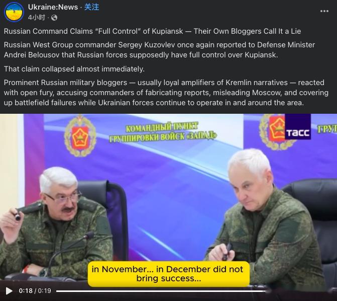 俄罗斯西部集团军指挥官谢尔盖·库佐夫列夫再次向俄罗斯国防部长安德烈·别洛乌索夫报告称,俄军已经完全控制库皮扬斯克!这个说法几乎立刻就被辟谣了,克里姆林宫自己的军事博主公开愤怒地回应,指责指挥官编造报告,误导莫斯科,并掩盖战场失败,乌克兰部队仍在该地区及周边活动。同时,英国军方的情报显示,在库皮扬斯克,阵亡一个乌克兰士兵,俄罗斯付出了27个俄罗斯人的代价。