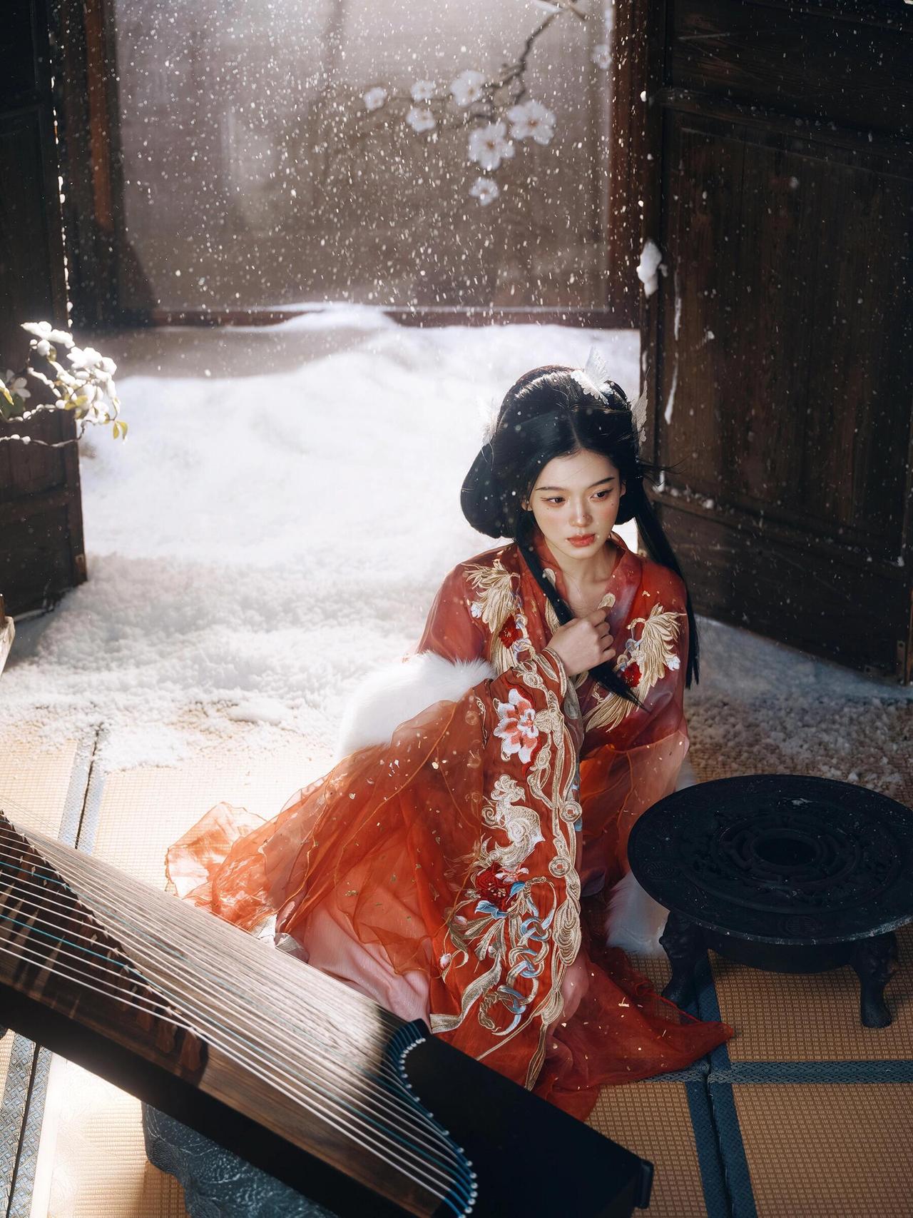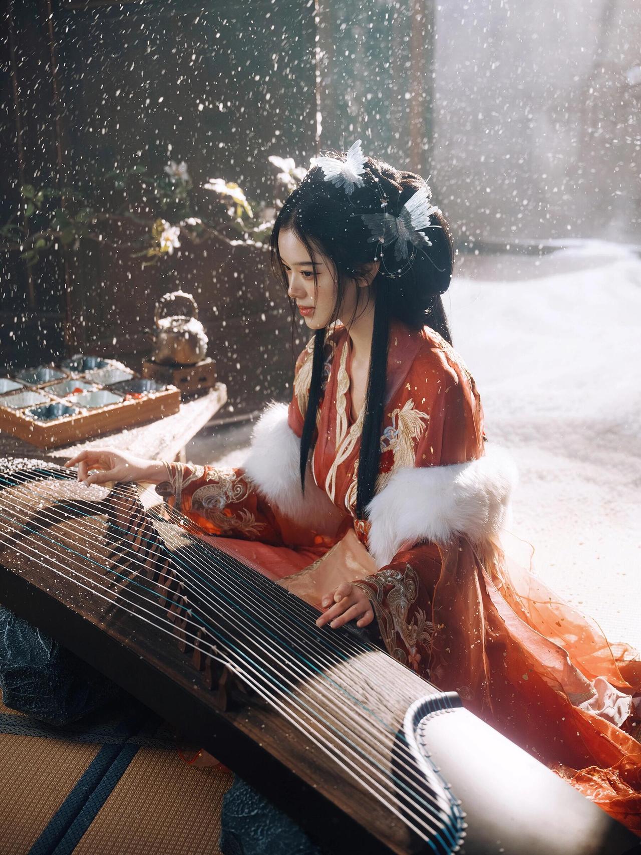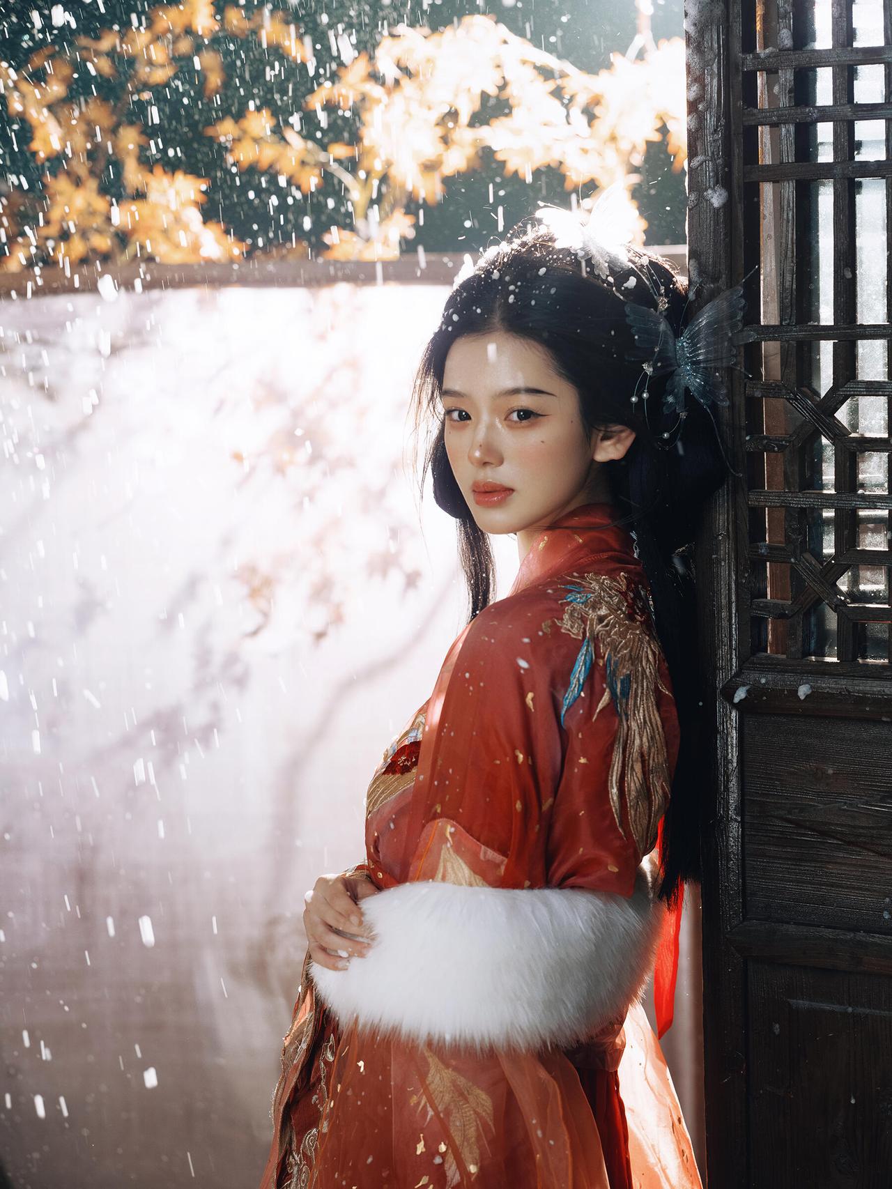 画面中人物抚筝的姿态舒展且富有韵律,指尖轻触琴弦的瞬间被精准捕捉,传递出“转轴拨弦三两声”的诗意。红色汉服的毛领装饰不仅符合冬日设定,更在色彩上与红色衣身形成材质对比,增添了画面层次。背景的木质屏风与斑驳墙面营造出古意盎然的空间感,人造雪粒的密度控制得当,既点明了雪景主题,又未干扰主体。光线采用柔和的散射光,均匀照亮人物面部与古筝,使细节清晰可见。若能在人物手部增加一点暖调反光,将进一步强化“红炉暖雪”的氛围感,让画面温度感更足。