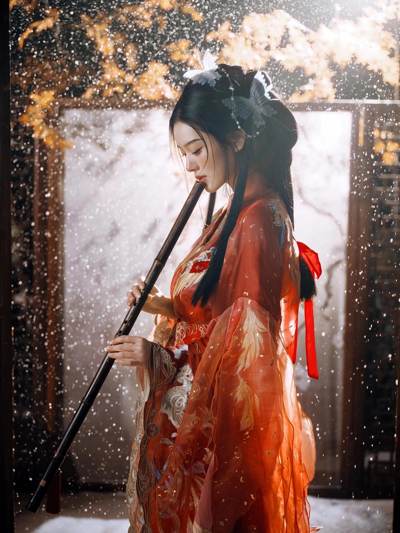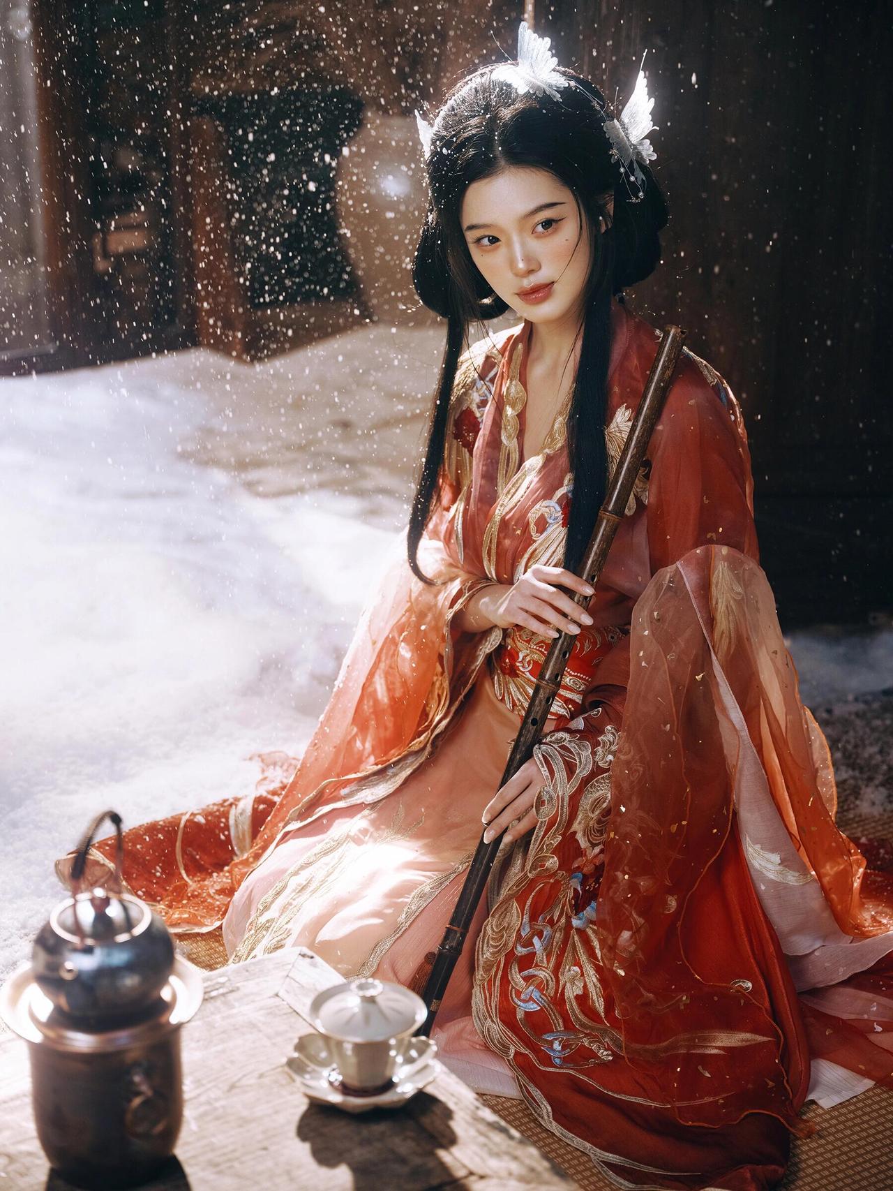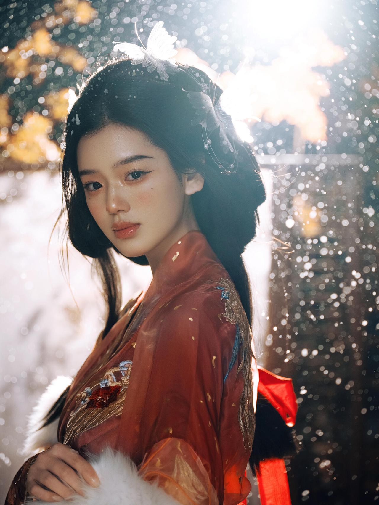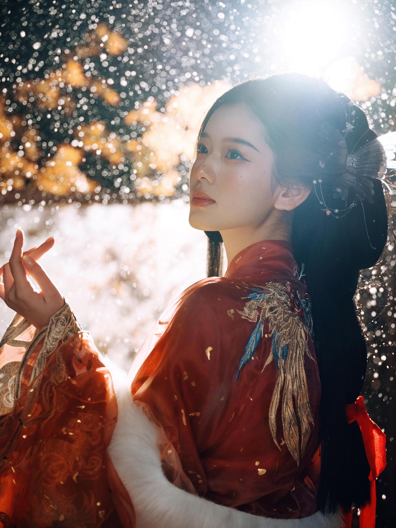 画面中人物抚筝的姿态舒展且富有韵律,指尖轻触琴弦的瞬间被精准捕捉,传递出“转轴拨弦三两声”的诗意。红色汉服的毛领装饰不仅符合冬日设定,更在色彩上与红色衣身形成材质对比,增添了画面层次。背景的木质屏风与斑驳墙面营造出古意盎然的空间感,人造雪粒的密度控制得当,既点明了雪景主题,又未干扰主体。光线采用柔和的散射光,均匀照亮人物面部与古筝,使细节清晰可见。若能在人物手部增加一点暖调反光,将进一步强化“红炉暖雪”的氛围感,让画面温度感更足。