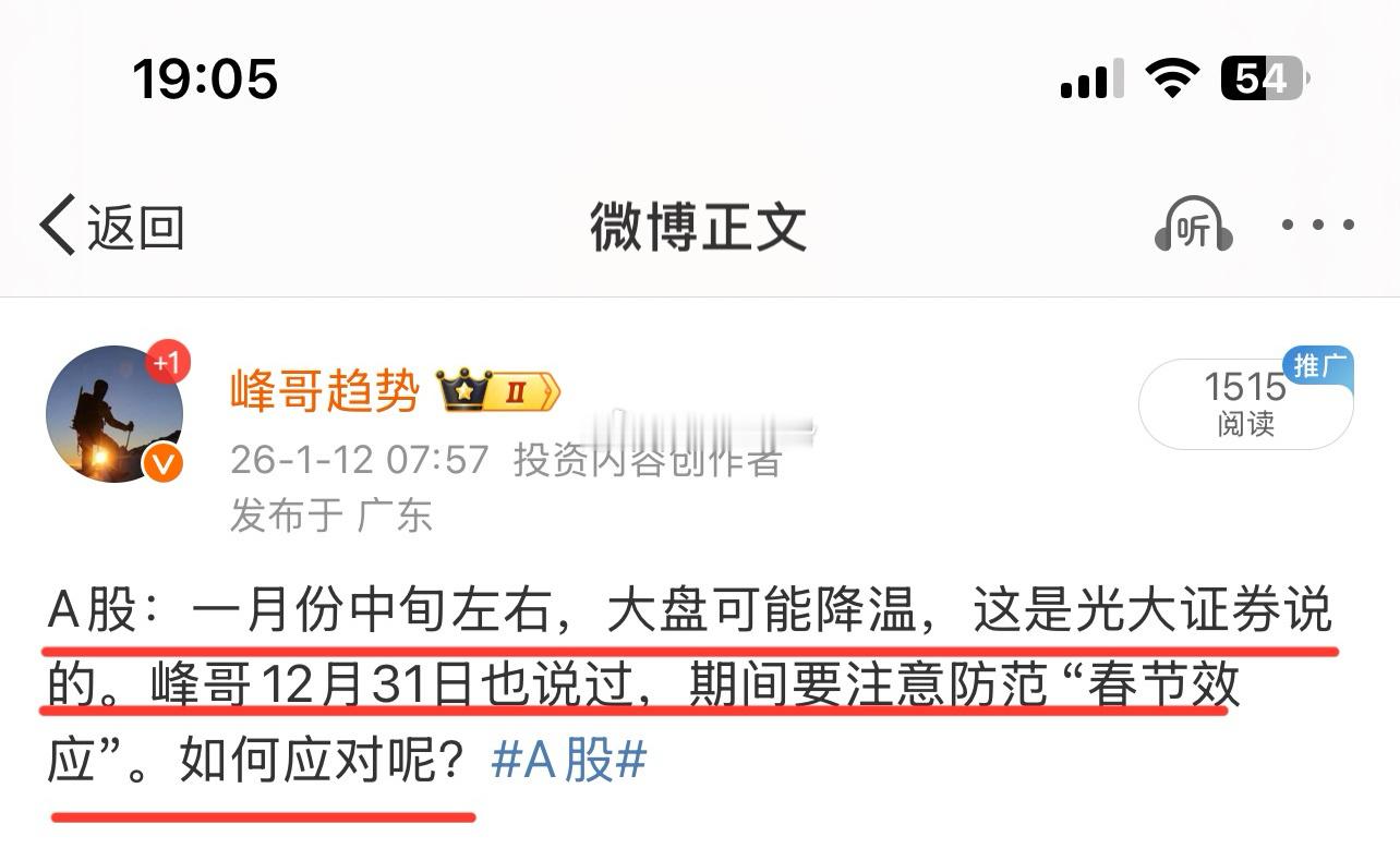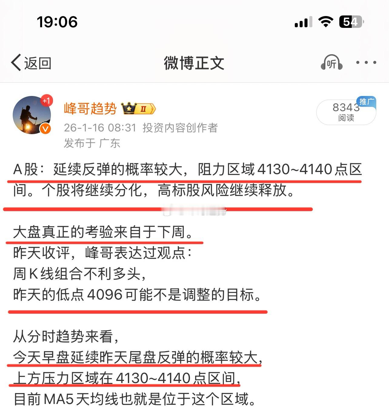 A股:股市要降温,峰哥12日开盘前就表达过这个观点。下周市场将出现短线反弹机会。1,市场回归理性峰哥12日判断市场要降温(“春节效应”),主要判断依据是技术面(周线级别背离)以及市场情绪。商业航天板块的成交金额占到了市场日交易额的近2成。峰哥当时就说过,2021年如日中天的白酒板块都没有过这种待遇。很显然,市场情绪过热,商业航天板块过热。股市降温的一个标志,就是高标股要下跌,要不然就不是降温。14日商业航天部分个股反抽,少数个股还创了新高(比如海格、东方等),吸引了很多投资者进场“抄底”。结果,15日和16日,商业航天板块继续退潮,板块高标个股批量跌停。教训深刻!市场降温的目的,是要市场回归理性,不盲目追高垃圾股,不盲目追高伪科技股。市场降温不代表市场就歇菜了。周五部分板块个股不错的表现,已经证明了这一点。毕竟有近3万亿的成交金额,不能都喝西北风。2,反弹机会下周大盘的反弹动力将是来自于超跌。目前分时趋势来看,大盘呈现的是逐级走低的状态(图),没有出现分时加速下跌,也没有放量。若下周初有个分时加速下跌的过程,那么就将出现短线反弹机会。跌到4040~4030点区域,大盘反弹的机会好一些,短线参与价值大一些。如果大盘下周初是上涨的,是较好的减仓机会,因为大盘可能就是个反抽。那么,下周的后半周,大盘依然存在跌破上周低点4091点的可能性。PS:峰哥周五盘前讲过4096点不会是低点,反弹阻力区域4130~4140点。上周五低点4091点,高点4140点——算得上精准。个人观点,仅供交流,不构成投资建议!理财有风险,投资需谨慎!