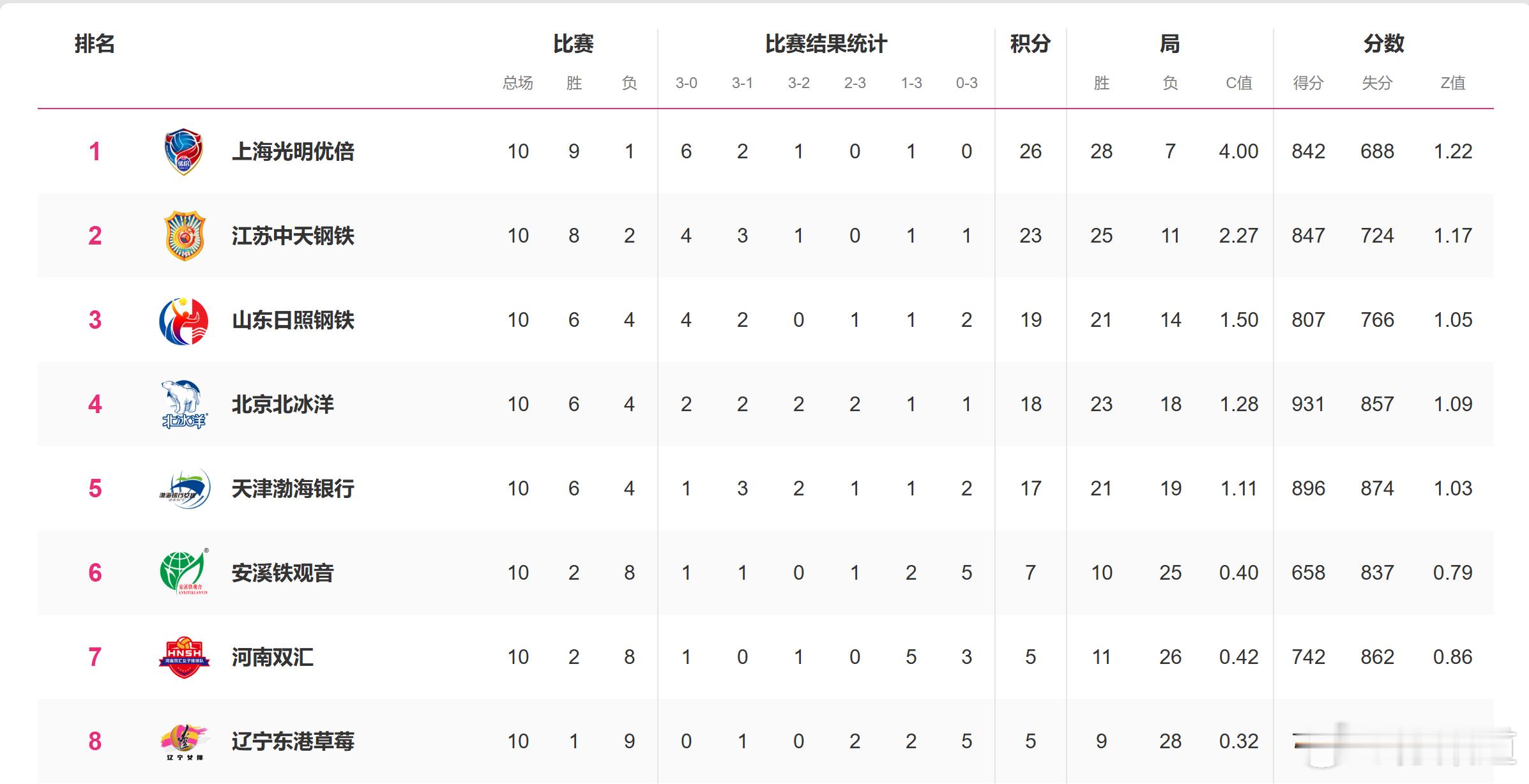 排超联赛2025-2026中国排球超级联赛 常规赛A级10轮战罢,最新积分榜 上海光明优倍:9胜1负,26分江苏中天钢铁:8胜2负,23分山东日照钢铁:6胜4负,19分北京北冰洋: 6胜4负,18分天津渤海银行:6胜4负,17分安溪铁观音: 2胜8负, 7分河南双汇: 2胜8负, 5分辽宁东港草莓:1胜9负, 5分
