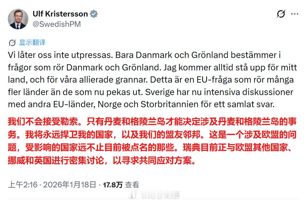 特朗普因格陵兰岛向欧洲8国加税瑞典首相乌尔夫·克里斯特松回应特朗普:“我们不会