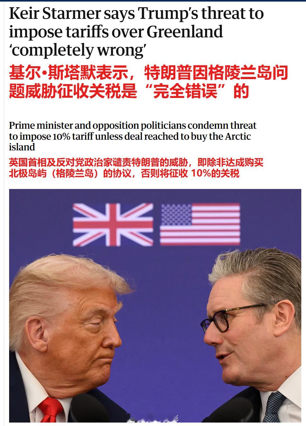 英国首相斯塔默发表声明,称特朗普因格陵兰岛向欧洲8国加税 是错误的。基尔·斯塔默表示,唐纳德·特朗普因格陵兰岛问题决定对英国及其他七个欧洲国家征收 10%关税的做法是“完全错误”的。他表示:“我们在格陵兰岛问题上的立场非常明确——它是丹麦王国的一部分,其未来由格陵兰人和丹麦人决定。”“我们也明确表示,北极安全对整个北约都至关重要,盟友们应该共同采取更多行动,应对俄罗斯在北极不同地区构成的威胁。“对追求北约集体安全的盟友征收关税是完全错误的。我们当然会直接与美国政府就此事进行交涉。”英国反对党政治人物也谴责了特朗普的威胁。保守党领袖凯米·巴德诺赫(Kemi Badenoch)表示:“特朗普总统因格陵兰岛问题宣布对英国征收关税是完全错误的。“这些关税将成为我们全国企业的又一负担。格陵兰岛的主权只能由格陵兰岛人民决定。”自由民主党领袖埃德·戴维(Ed Davey)表示:“斯塔默的对美政策已化为泡影。特朗普现在正因为英国和北约盟友做了正确的事情而惩罚他们。”“现在是首相挺身对抗白宫霸凌者的时候了,应与欧洲及英联邦盟友合作,迫使他放弃这一鲁莽计划。”改革党领袖奈杰尔·法拉奇(Nigel Farage)表示,特朗普对格陵兰征收关税将“伤害”英国。他说:“我们并不总是同意美国政府的观点,在这种情况下,我们当然不同意。”工党沃尔瑟姆斯托选区议员斯特拉·克里西(Stella Creasy)表示:“特朗普的关税和威胁意味着到了做决定的时候了。如果我们不能依赖美国,又不想讨好中国,那么答案就是认真对待我们与欧洲的战略未来。”“北约也需要这一点——重启必须是真实的,而且为了我们所有人的利益,必须迅速发生。”海外新鲜事特朗普无论难易都要得到格陵兰岛