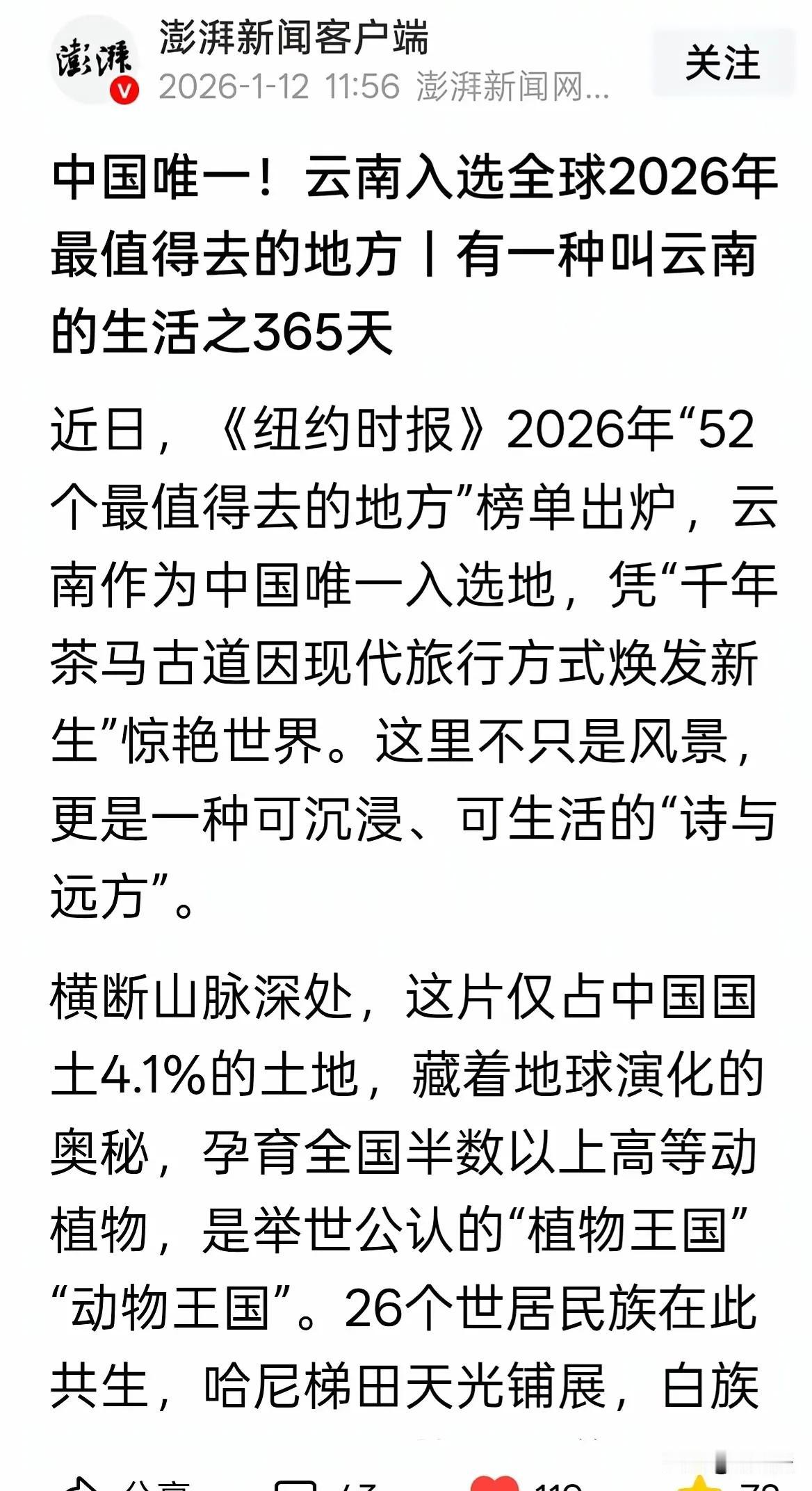 云南入选全球著名杂志“纽约时报”所选的全球最佳首选52个目的地之一。云南也是中国