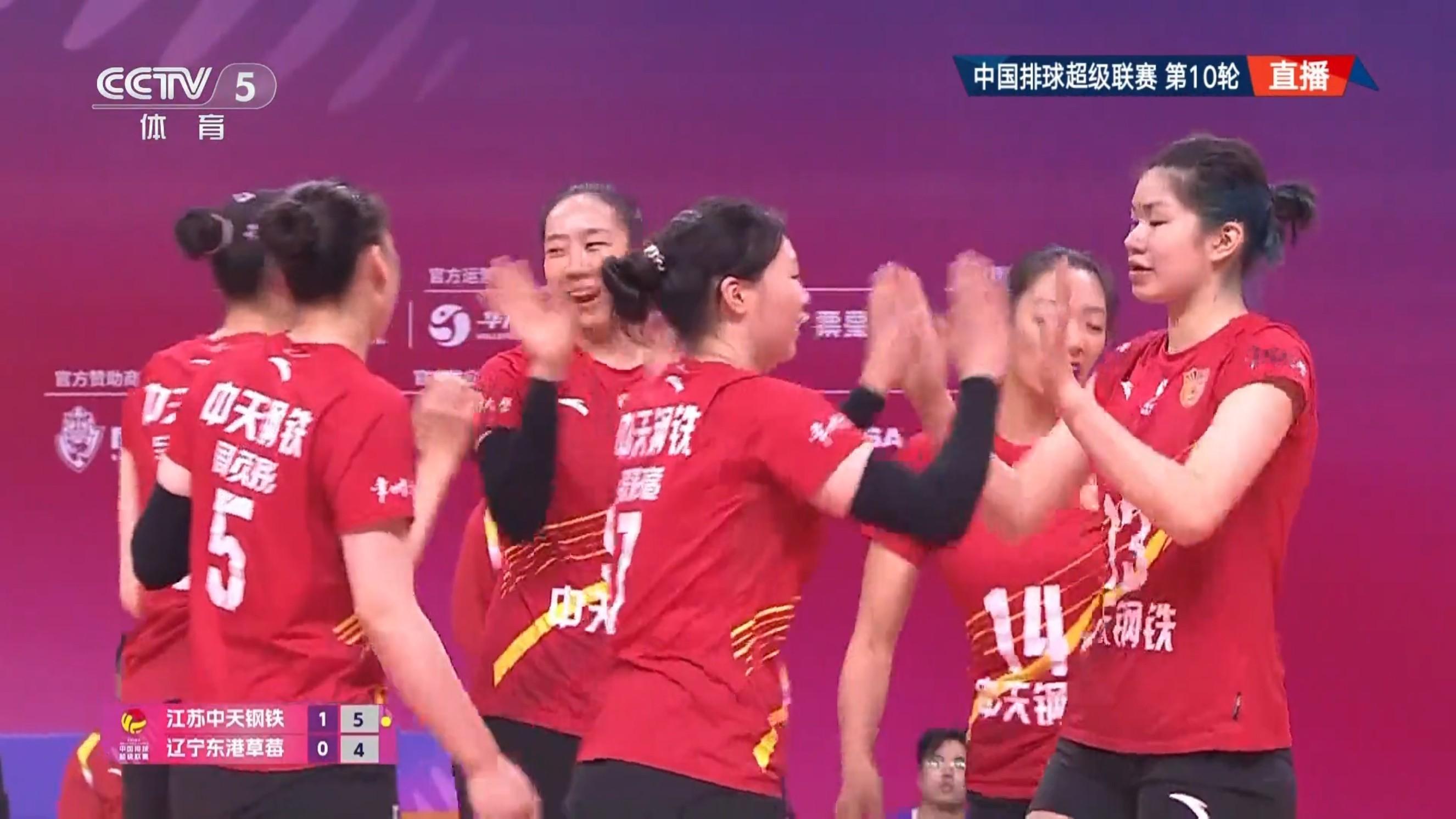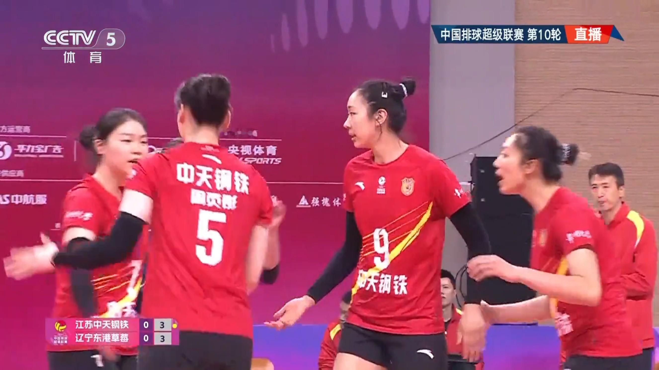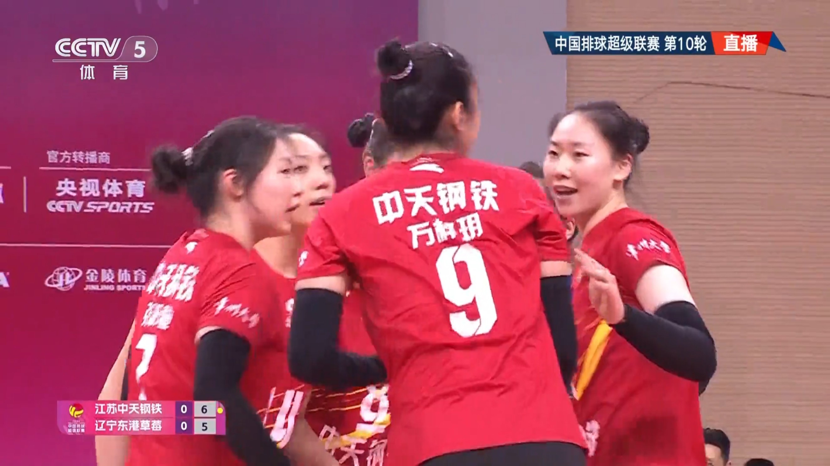 中国排球超级联赛 中国排球超级联赛女排A级常规赛昨天展开第十轮比赛。卫冕冠军江苏中天钢铁女排在主场以3比0横扫辽宁东港草莓女排,赢得常规赛第八场胜利。这场比赛江苏队打得很漂亮,从主攻线,副攻线,防守到网口都全面开花。第一局开局时,江苏队有点慢热,辽宁队进入壮态很快,两队打到7平,但之后江苏队很快拉开分差,以25比16拿下。第二局比赛完全一边倒,江苏队25比14再下一局。第三局,辽宁队拼力抵抗,一直在追分,但因为实力差距,无力回天,江苏队以25比18赢下此局,结束了全场比赛。本场比赛吴梦洁,唐欣,郭中楠,张籽萱,倪非凡等发挥非常出色。在小二传张籽萱的出色组织和调度下,主攻线和副攻线都发挥了强大的威力!图源:央视直播截屏
