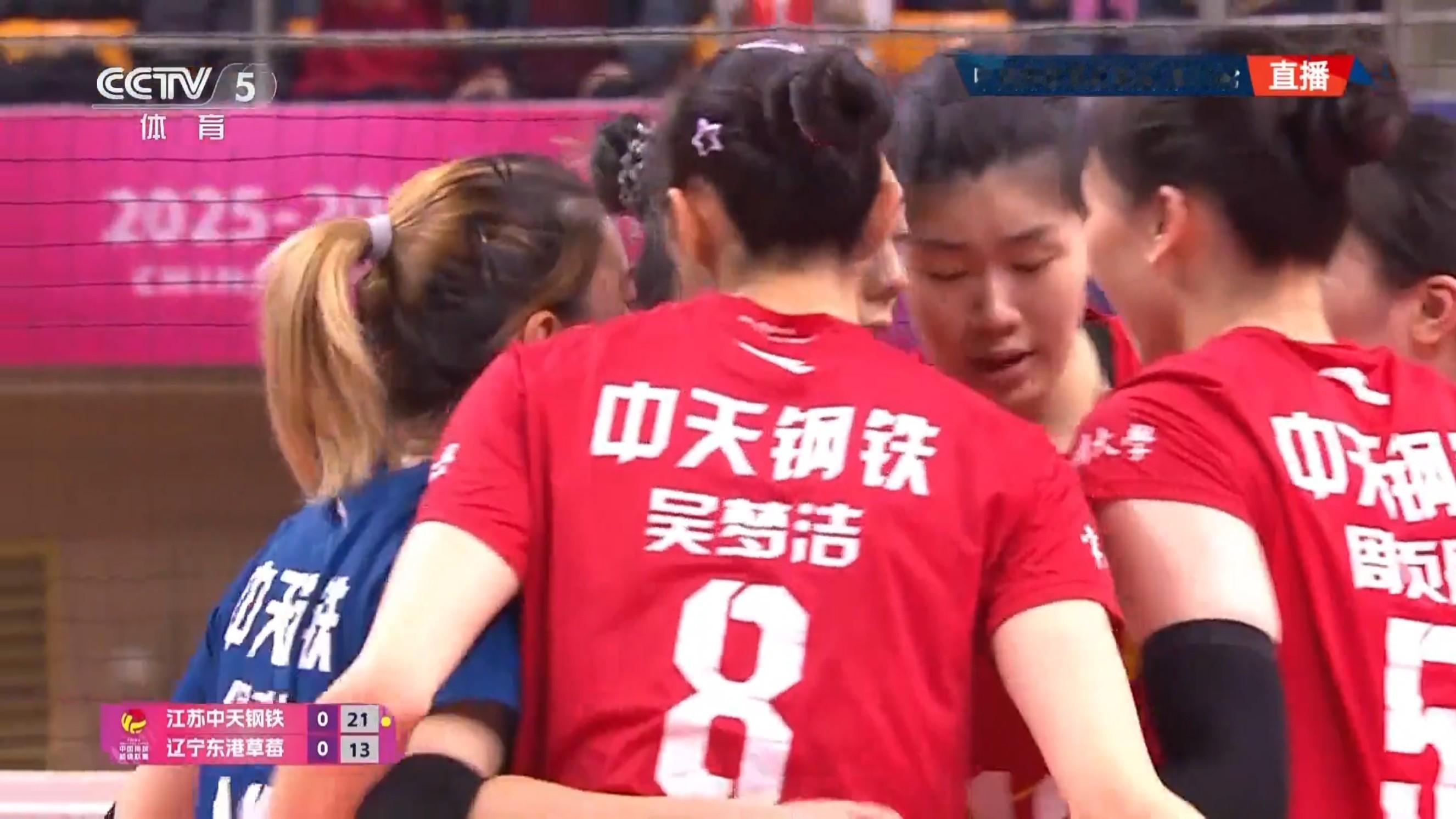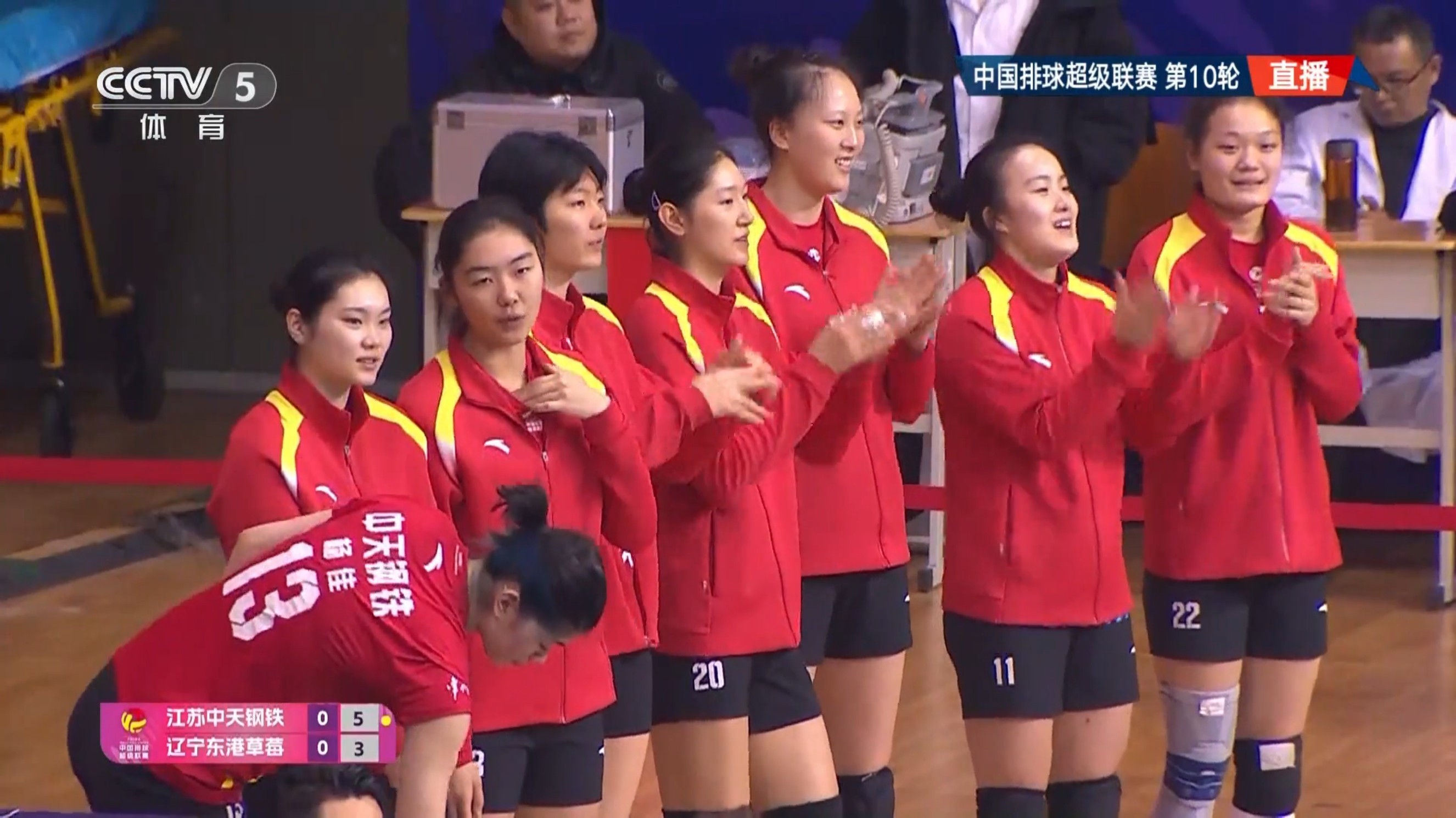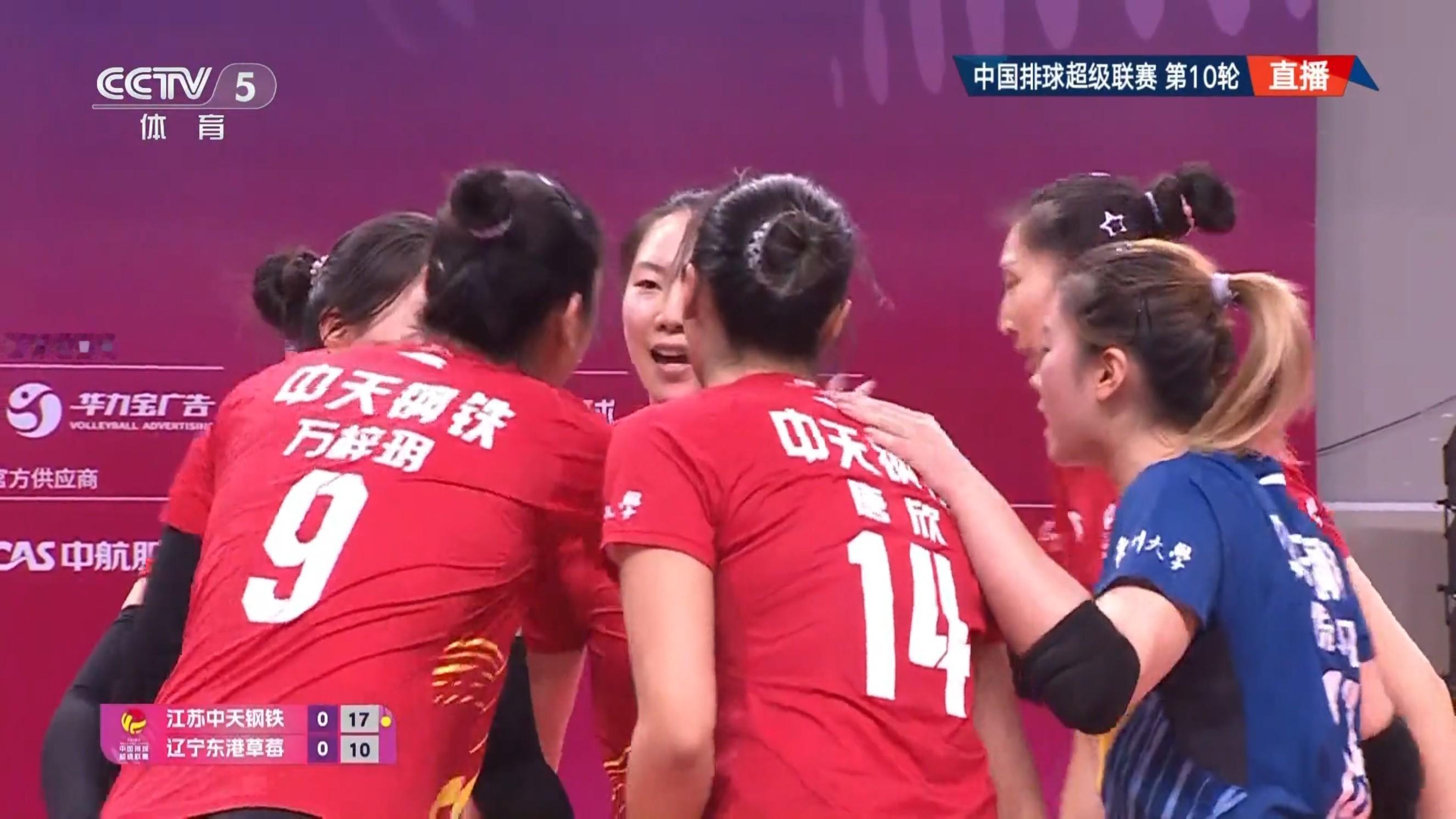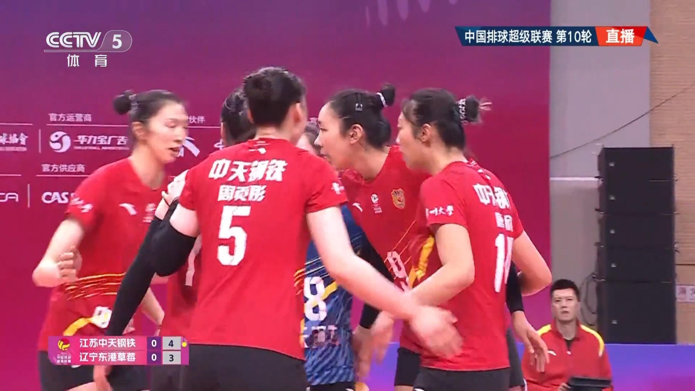 中国排球超级联赛 中国排球超级联赛女排A级常规赛昨天展开第十轮比赛。卫冕冠军江苏中天钢铁女排在主场以3比0横扫辽宁东港草莓女排,赢得常规赛第八场胜利。这场比赛江苏队打得很漂亮,从主攻线,副攻线,防守到网口都全面开花。第一局开局时,江苏队有点慢热,辽宁队进入壮态很快,两队打到7平,但之后江苏队很快拉开分差,以25比16拿下。第二局比赛完全一边倒,江苏队25比14再下一局。第三局,辽宁队拼力抵抗,一直在追分,但因为实力差距,无力回天,江苏队以25比18赢下此局,结束了全场比赛。本场比赛吴梦洁,唐欣,郭中楠,张籽萱,倪非凡等发挥非常出色。在小二传张籽萱的出色组织和调度下,主攻线和副攻线都发挥了强大的威力!图源:央视直播截屏