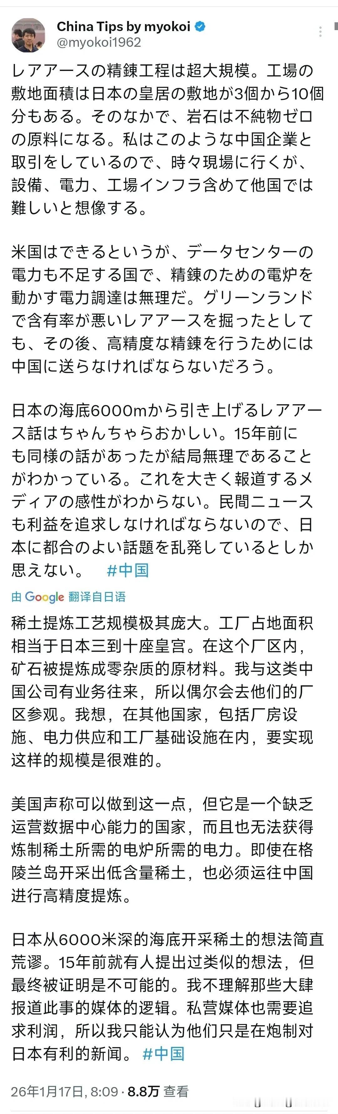 1月17日,一个亲自参观过我国稀土提炼工厂的日本人在社交平台发文,竟然毫不客气地