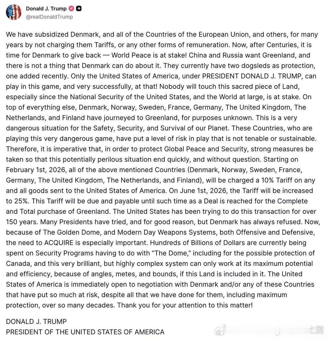 特朗普因格陵兰岛向欧洲8国加税 特朗普宣布,将从2026年2月1日起对八个欧洲国家(丹麦、挪威、瑞典、法国、德国、英国、荷兰和芬兰)征收额外关税,原因是这些国家在格陵兰岛问题上不支持美国。特朗普指控这八个欧洲国家在格陵兰岛问题上玩“危险的游戏”,并表示这些关税将持续征收,直到美国与丹麦就“全面、彻底购买格陵兰岛”达成协议为止。税率:初始关税税率为10%,如果僵局持续,将于2026年6月1日提高至25%。特朗普已经成为“黑天鹅”和不稳定因素,没人可以预测他。对于2026年的世界而言,特朗普的不可预测性本身就是最大的风险。他倾向于通过“制造混乱”来获取谈判筹码,这种执政风格在2026年中期选举的政治压力下会被进一步放大,使全球政治经济陷入一种“持续性震荡”的状态。
