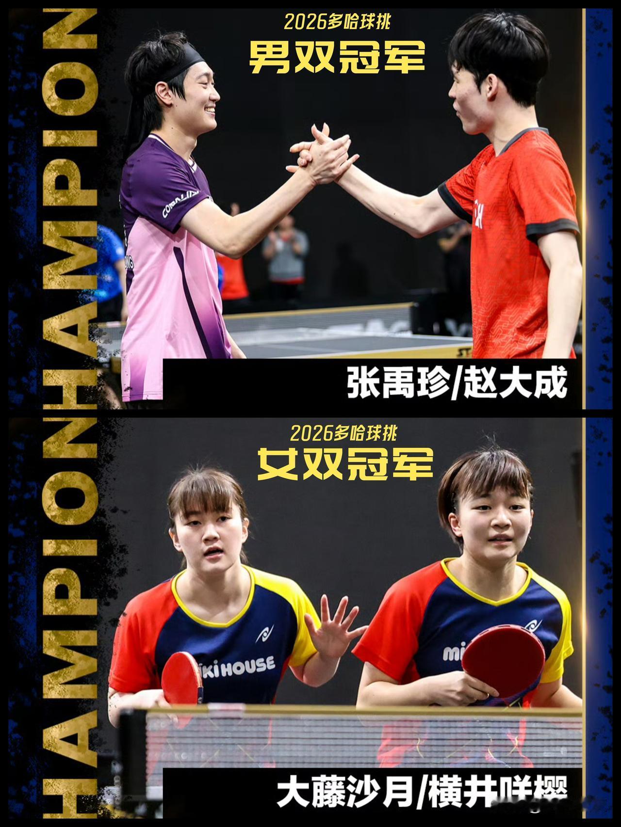 【多哈球挑男女双打收官!日韩各一冠国乒仅斩获一座亚军!】 女双决赛,日本组合横井咲樱/大藤沙月3-0完胜另一对日本组合佐藤瞳/芝田沙季夺冠,三局比分:12-10、11-4、11-9。 日本包揽女双冠亚军!佐藤瞳和大藤沙月双线作战,两人都杀进了女单半决赛。 男双决赛,韩国组合张禹珍/赵大成3-2逆转国乒组合黄友政/温瑞博夺得冠军,五局比分:5-11、11-8、11-6、5-11、11-9。 名副其实的险胜,韩国组合拿走男双冠军。 混双方面,随着陈垣宇/蒯曼半决赛1-3不敌韩国组合朴康贤/金娜英出局,国乒组合已全部出局,冠军将在韩国和中国香港之间产生。 三项双打,国乒颗粒无收!