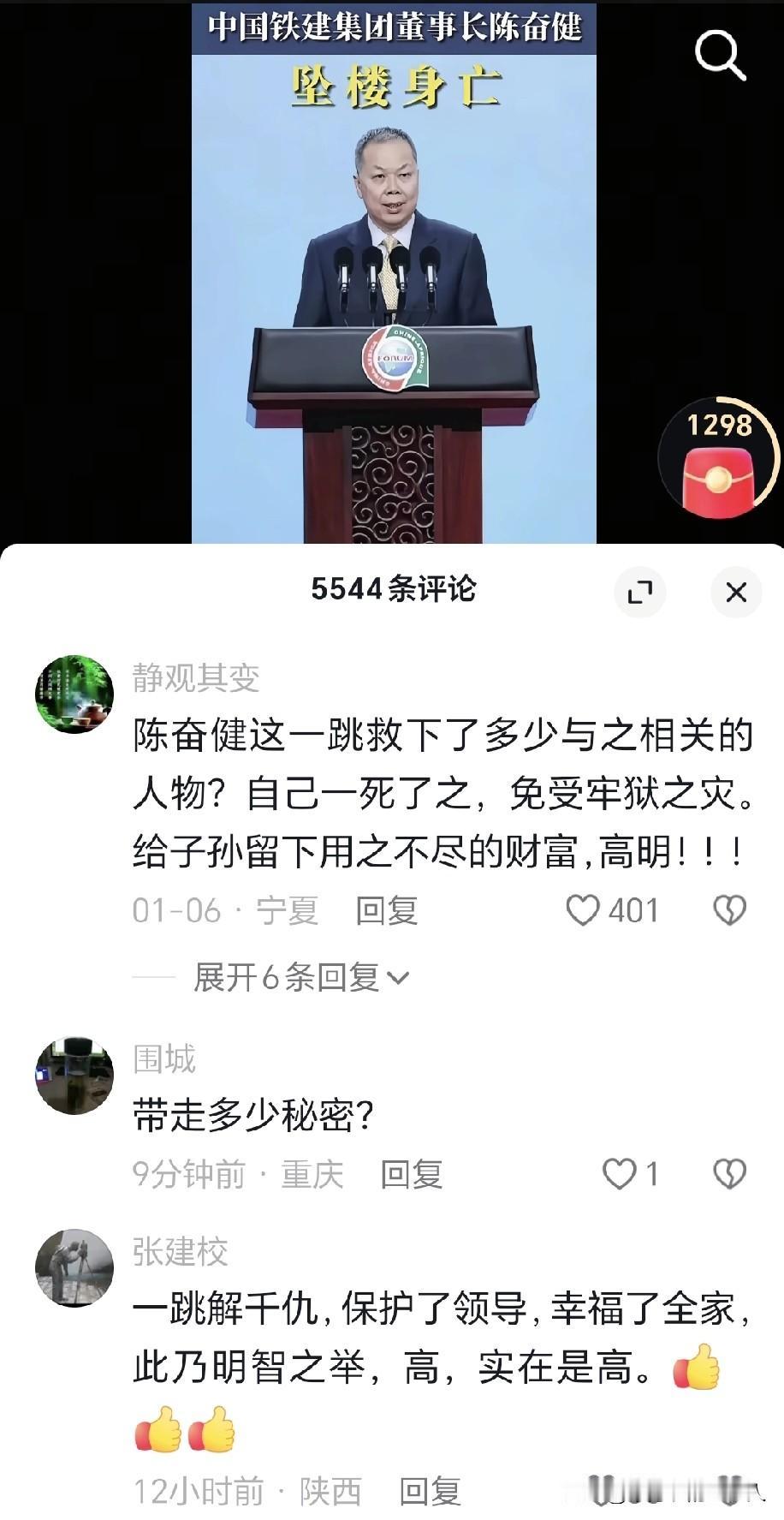 当中国铁建集团董事长陈奋健坠楼身亡的消息传出,舆论场没有泛起应有的哀悼与惋惜,反而是清一色的负面揣测与冷嘲热讽: “解放了老婆孩子、市长各级领导干部” “人死账清,牺牲一人造福后代” “救下无数相关人物,高明至极”等。 这些高赞留言如同一面棱镜,映照出当下老百姓对国企高管的信任危机。其核心逻辑在于“国企高管”身份与“权力寻租”的刻板关联。 近年来,部分国企腐败案件的曝光,持续冲击着公众的信任底线,使“非正常死亡=畏罪自保”的阴谋论叙事在舆论场得到了畸形的共鸣。而官方通报的含糊不清,进一步加剧了信息不对称,为猜疑提供了滋生的土壤。 这种舆论畸变的根源,其一在于信任割裂。掌握公共资源的国企高管与普通民众之间存在阶层差距,腐败案例放大了群体间的隔阂,致使公众对相关群体的悲剧失去了共情能力,转而用恶意揣测取代理性判断。 其二是算法起到了推波助澜的作用。网络平台“流量至上”的逻辑,让冲突性、猎奇性言论更易传播,形成了“负面言论越集中,传播越广泛”的恶性循环,理性声音逐渐被淹没。 其三是制度焦虑。国企领域监督机制与信息公开制度的不完善,使公众缺少有效渠道参与监督,只能通过网络质疑来缓解对权力运行不透明的担忧。 生命的逝去本应唤起敬畏与反思,然而在官员身上,网友的态度却截然相反,这不得不说是一种讽刺。