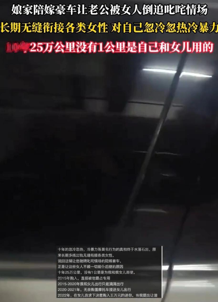 事实证明,车不是女人开,就不要陪嫁豪车,否则就是给别人做嫁妆。 10年25万公里,日均70公里,没有1公里是老婆和女儿用的。陪嫁的豪车成了老公装阔的资本,让女人为之倾倒,让老公叱咤情场。 那辆曾经承载着女方家庭满满祝福的豪车,如今却成了男人背叛的“帮凶”。 长期出轨,十年的冷暴力,这良心是给狗了!都说婚姻是一场赌注,可这女人却输得彻彻底底。 如果我没看错,这是奔驰C系吧,这也算豪车?也奇怪,就这些出轨的女是没见过豪车吗?看见奔驰,就贴上来了?