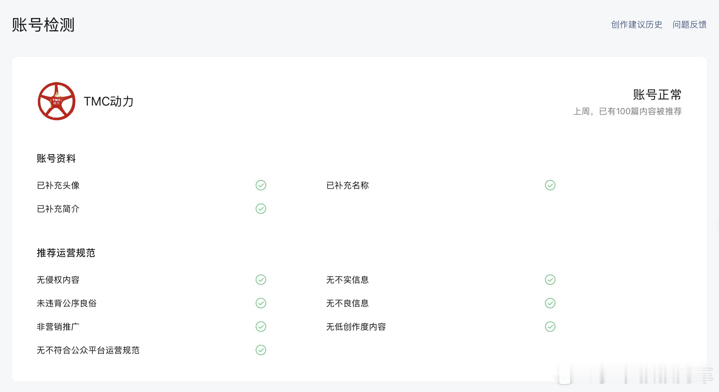 微信公众号功能越来越丰富了,新增加热功能之外,多了这个账号检测,让用户对自己账号情况一目了然,我们TMC动力账号暂时“正常”。微信公众号账号检测 广州