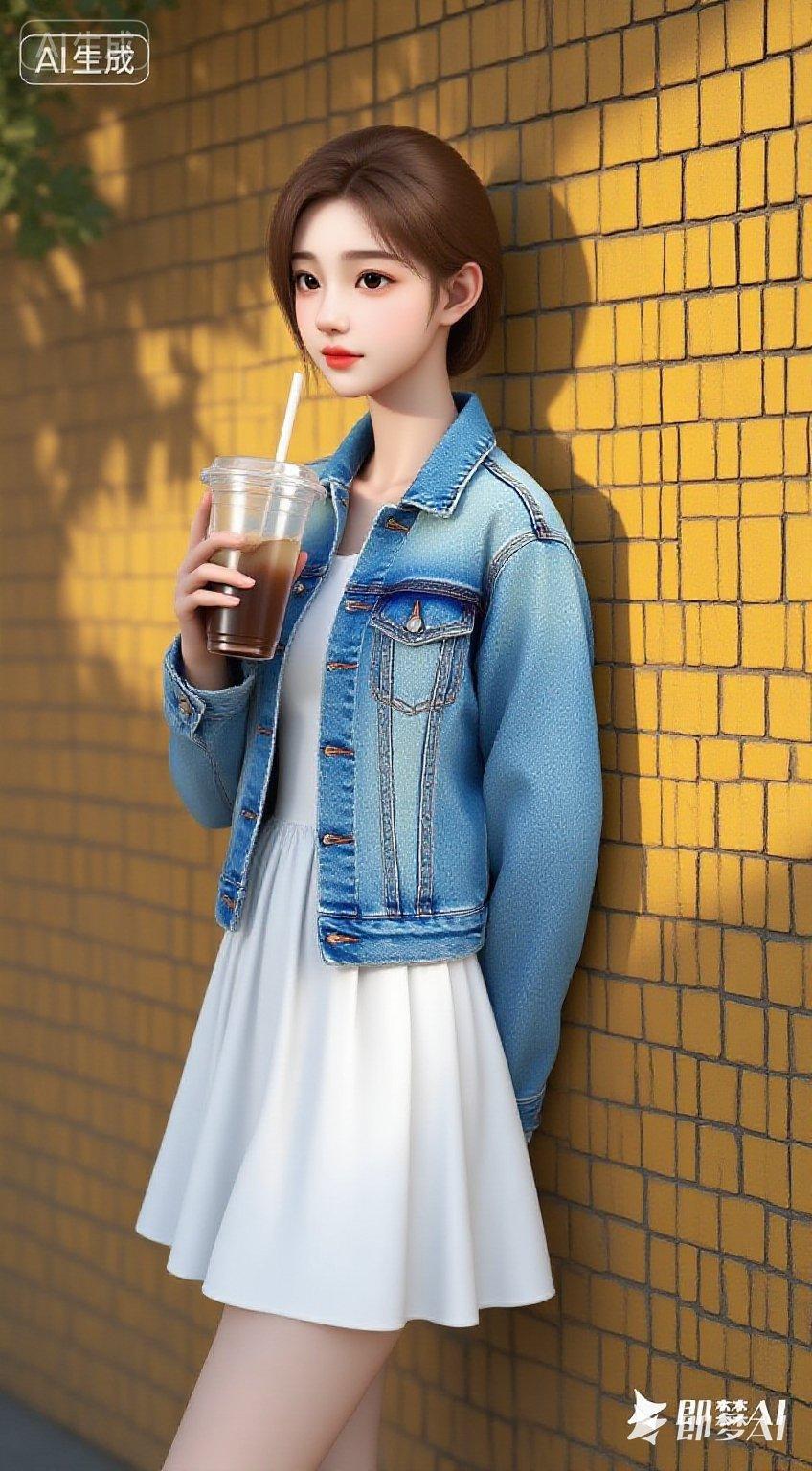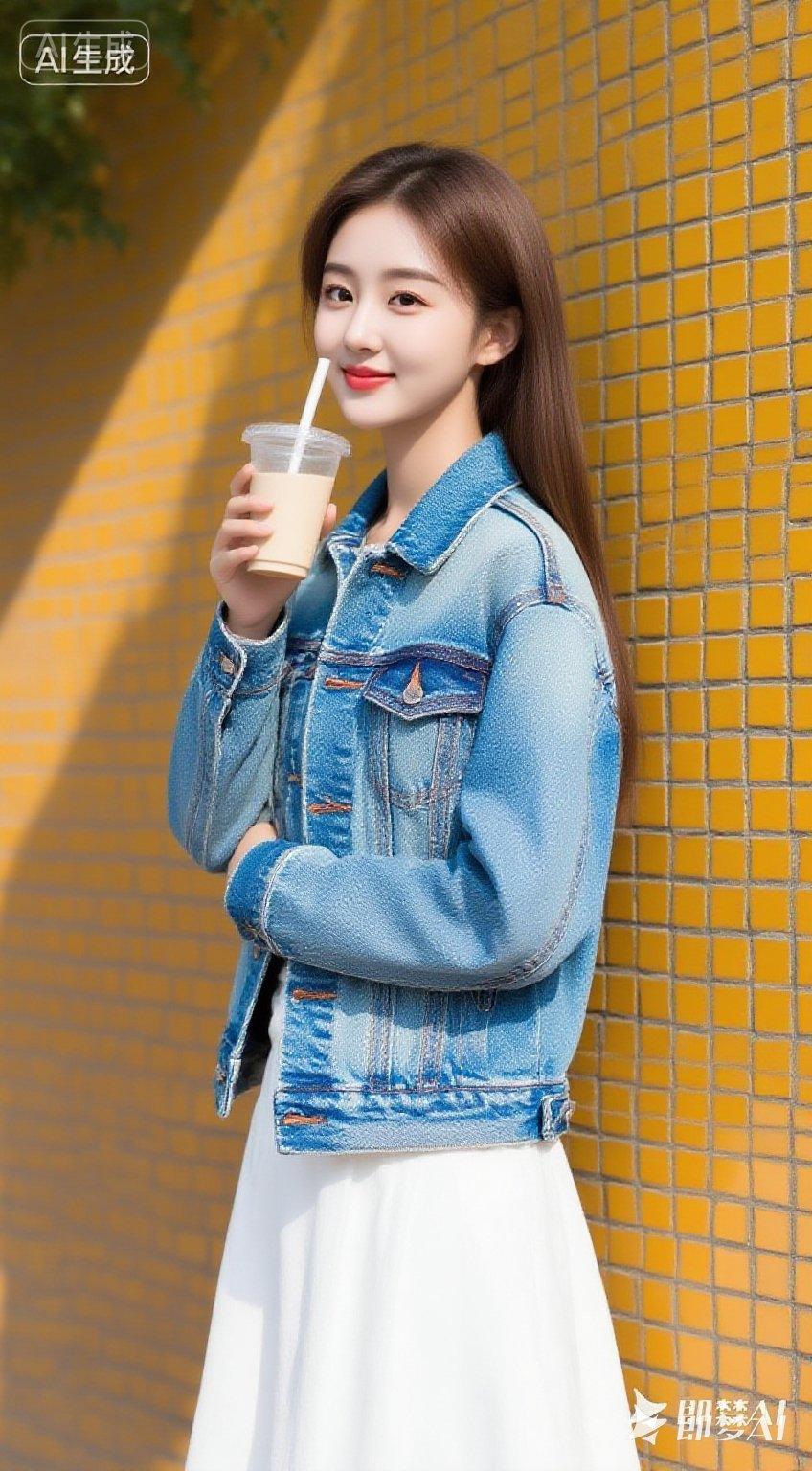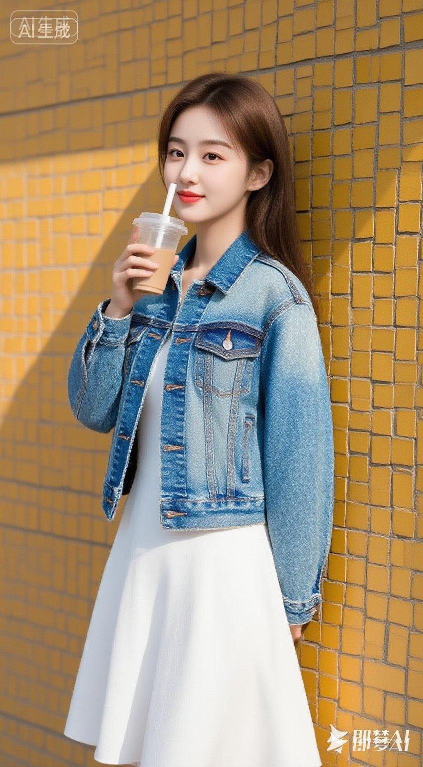 晒图笔记大赛东亚年轻女性,棕色长发,身穿米色短款皮夹克、白色内搭、牛仔短裤,背着