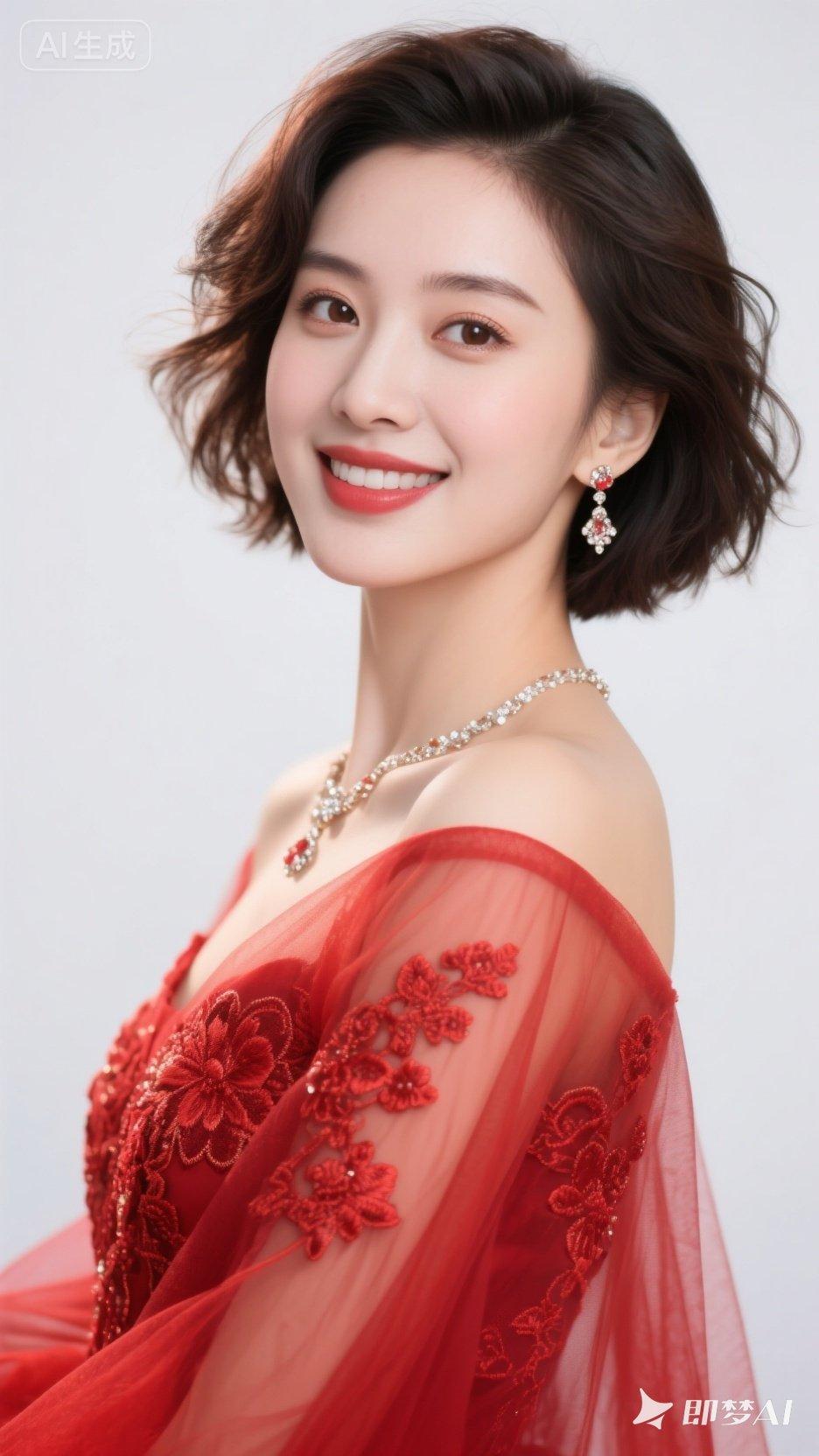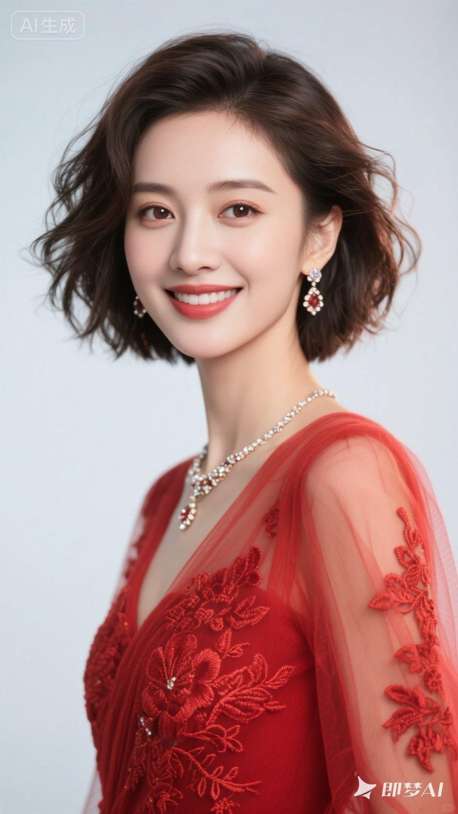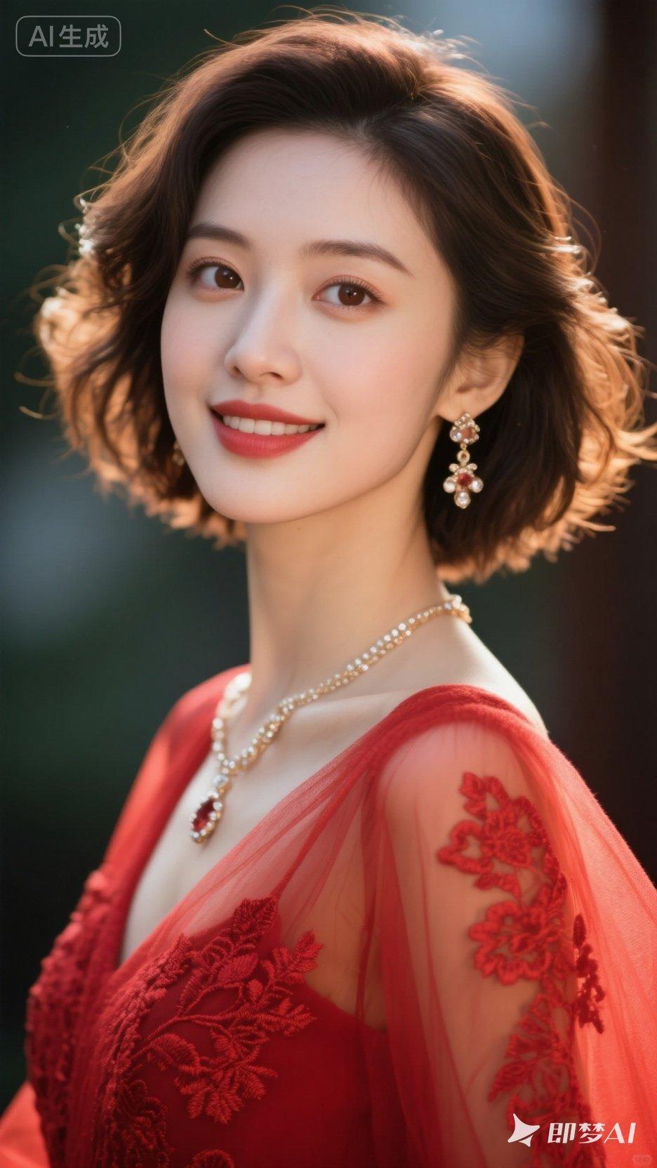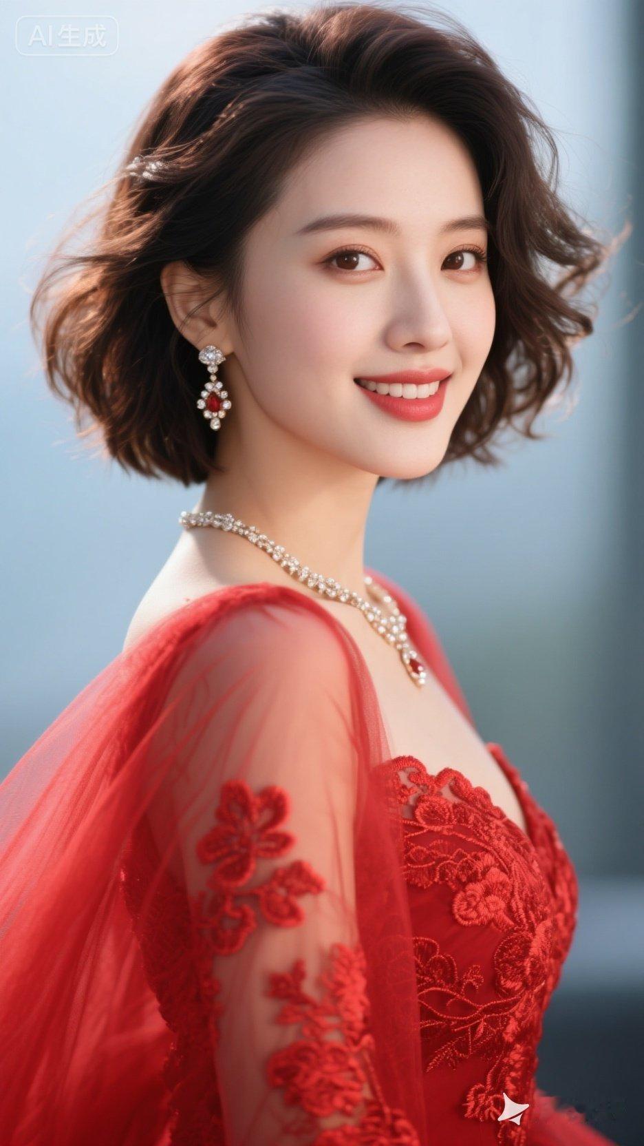 绝色美人更美,肤白细腻光滑,大眼睛双眼皮,短发飘逸微卷,蓬松,微光,超级美女,时尚红色羊绒绣花清凉欧根纱,高档项链耳环,回眸一笑百媚生