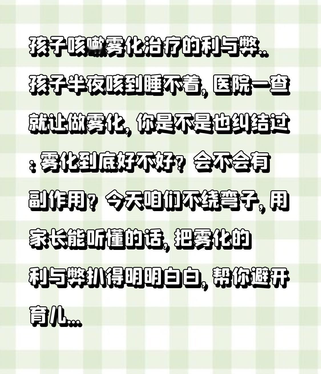 孩子咳嗽雾化治疗的利与弊.. 孩子半夜咳到睡不着,医院一查就让做雾化,你是不是也纠结过:雾化到底好不好?会不会有副作用?今天咱们不绕弯子,用家长能听懂的话,把雾化的利与弊扒得明明白白,帮你避开育儿坑! 前几天闺蜜急得直掉眼泪,3岁女儿咳嗽一周,咳到喘不上气,医生建议雾化治疗,可她刷到网上说“雾化比输液还伤娃”,硬是拖着不敢做,结果孩子病情加重住进了医院。相信很多家长都有过这种纠结:雾化到底是救急的好办法,还是伤娃的“隐形杀手”? 先给结论:雾化本身没有好坏,关键看怎么用! 很多家长对雾化的误解,其实都源于信息差。咱们先说说雾化的“利”,这也是它成为儿科常用治疗方式的核心原因。 雾化最大的优势就是直接高效。药物通过雾化器变成微小颗粒,直接吸入呼吸道和肺部,就像给喉咙和气管“局部上药”,不用经过肠胃吸收、肝脏代谢,起效特别快。孩子咳嗽痰多、喘息时,雾化能快速稀释痰液、缓解气道痉挛,比口服药见效快,还避免了打针输液的痛苦,很多抗拒吃药的宝宝也能接受。 我家孩子去年支气管炎,咳得整夜哭闹,医生开了雾化药,做了两次就明显好转。而且雾化的用药剂量特别小,是口服药的几十分之一,全身副作用大大降低,对肝肾功能的负担也小,这对体质娇嫩的孩子来说,无疑是更安全的选择。 但这里要划重点,也是最容易踩坑的转折点:雾化不是“万能止咳药”,滥用反而伤娃! 现在很多家长一看到孩子咳嗽,就自己买雾化机、随便找药给孩子做,这才是最危险的。 首先,雾化药有严格的适应症。只有哮喘、支气管炎、肺炎等明确的呼吸道疾病,用雾化治疗才有效;普通感冒引起的干咳,做雾化不仅没用,还可能破坏呼吸道黏膜。其次,雾化药里常含激素,虽然局部用药副作用小,但长期滥用会导致口腔念珠菌感染、声音嘶哑等问题,必须在医生指导下使用。 还有家长忽略的细节:雾化后不及时漱口,药物残留会刺激喉咙;雾化器不消毒,容易滋生细菌,反而加重感染。这些看似小事,却可能让“治病”变成“致病”。 儿科医生反复强调:雾化是“对症治疗”的工具,不是日常止咳的“法宝”。孩子咳嗽时,先判断病因,由医生决定是否需要雾化、用什么药、做多久,这才是对孩子负责。 作为家长,咱们都想让孩子少受罪、快点好,但千万别被“雾化无副作用”“雾化能治所有咳嗽”的说法误导。正确使用雾化,它就是缓解孩子不适的“神器”;盲目滥用,只会给孩子的健康埋隐患。 如果孩子正在咳嗽,你会选择雾化治疗吗?欢迎在评论区分享你的育儿经验,也别忘了转发给身边的宝妈宝爸,让更多人科学育儿、少走弯路!