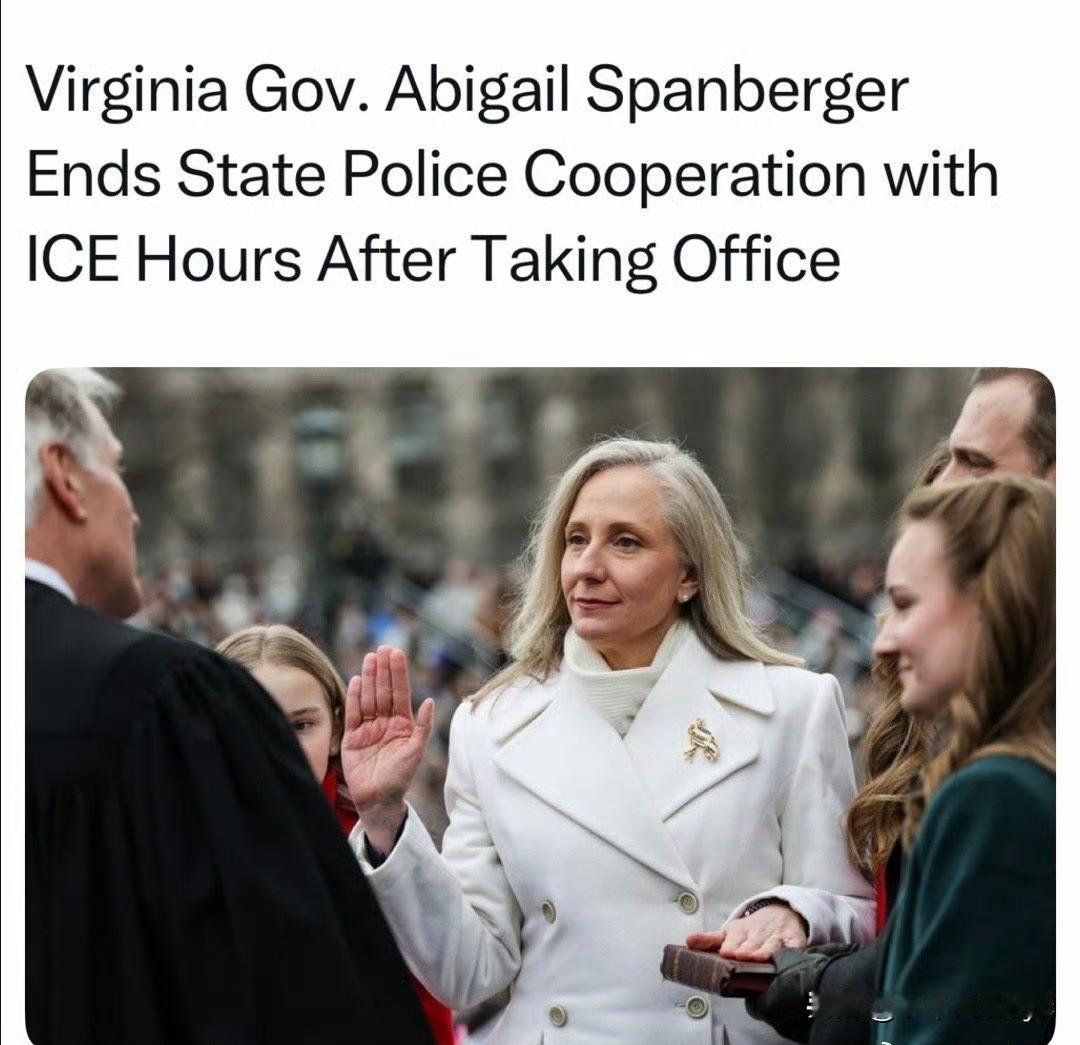 弗吉尼亚新州长阿比盖尔·斯潘伯格(Abigail Spanberger),今天宣誓就职。做的第一件事是立刻下令,终止州警与ICE(边境执法局)的合作。 她的职业背景是中情局特工,负责在海外收集情报。 弗吉尼亚新当选州长为阿比盖尔·斯潘伯格(Abigail Spanberger),她于2025年11月击败共和党候选人温瑟姆·厄尔-西尔斯,成为该州历史上首位女性州长。 斯潘伯格为中间派民主党人,曾任三届联邦众议员及中情局前特工,其竞选主打“反对特朗普政策”和“保护弗吉尼亚免受华盛顿混乱影响”的务实路线。 民主党又赢得一洲,对于今年的中期选举,特朗普又多了一层忧虑。 不久前,特朗普曾号召共和党,全力以赴备战中期选举,他不无忧虑的表示,如果民主党赢得中期选举,他將面临被弹劾的风险。足见其对今年中期选举的获胜没有把握,充满恐慌。