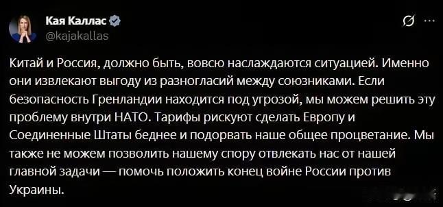 卡拉斯认错了亲,求特朗普放过保护格林陵兰岛的国家,这无异于向火乞儿。 欧盟外长卡拉斯把美国当亲人,她没有反对特朗普侵占格陵兰岛,但她认为特朗普向反对侵占的七国加征10%的关税是亲者痛仇者快,她认为,特朗普应帮助欧洲在乌克兰对付俄罗斯,再联合欧洲对付东大,但卡拉斯认错了亲。 加拿大在严格意义与美国的关系比欧洲更亲近,但加拿大总理卡尼在近日的访问中提出了为“新国际秩序”作准备,并认为旧秩序已松动,世界需要重新在优化组合。 卡拉斯显然没有卡尼这么高的认识,她仍然沉迷醉于美国的一极世界,沉迷在北约的襁褓中,把特朗普当“父亲”,寄希望于美国把俄罗斯当问题解决,并希望借美之力打压东大新能源产业,但她忽略了一个事情,此时美国已无力更无意此举,但它却有意于搜刮盟友,以便于在未来的“新秩序”中占据更有利的位置,在这种情况下,卡拉斯的认亲,无异于与虎谋皮,也许向火乞儿更恰当,毕竟,格陵兰岛是欧洲国的领地。