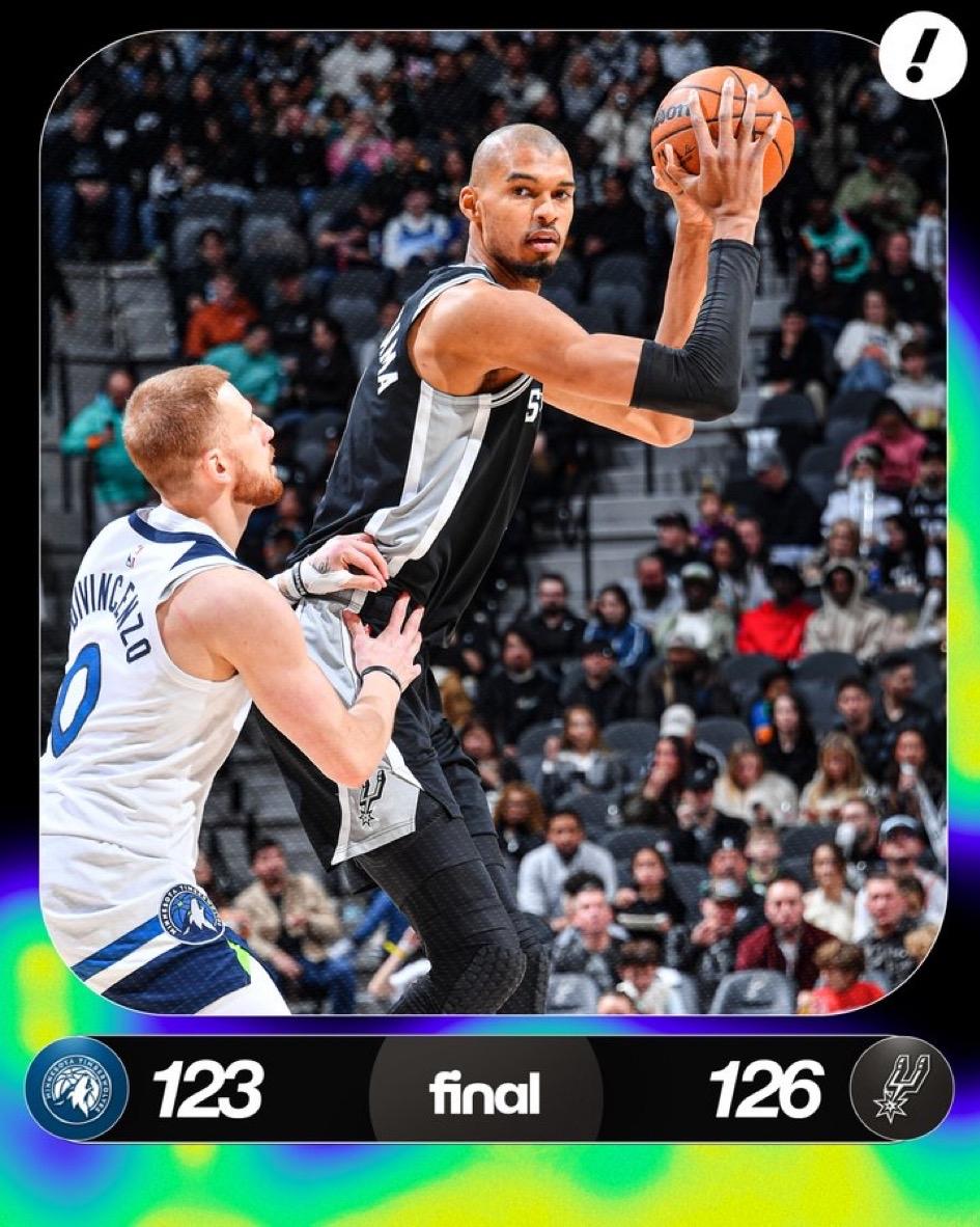 一时糊涂啊!文班的最后一罚有点不可思议!本来你可以领先4分锁定胜局,但他却故意投偏,球甚至都没碰到篮筐。 结果违例了,要不是没有足够时间,比赛还有悬念。 这场比赛最刺激,不光诞生出球队老大的高光,比赛还充满了刺激和悬念,最终马刺险胜森林狼。
