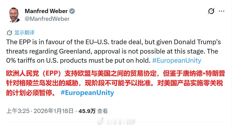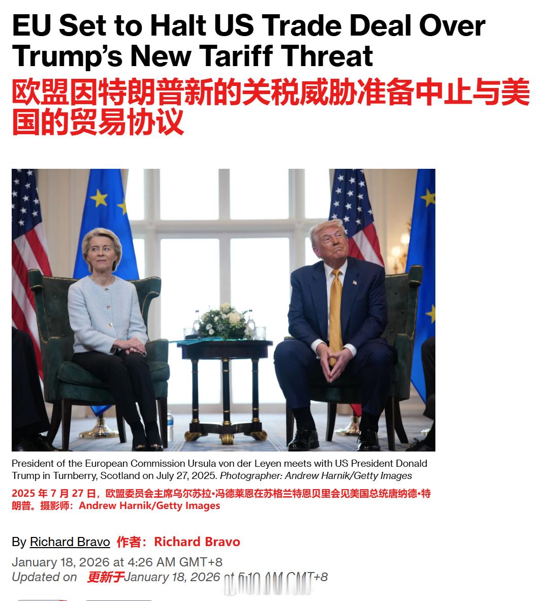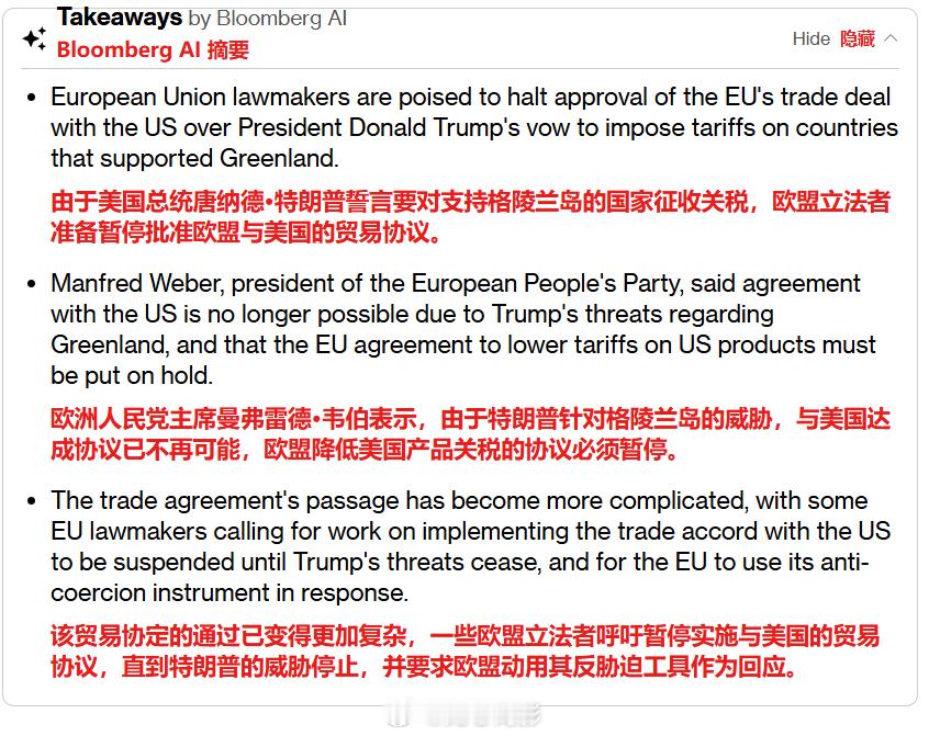 欧盟的“报复”?彭博社报道称,欧盟因特朗普新的关税威胁准备中止与美国的贸易协议。欧洲议会最大政治团体——欧洲人民党主席曼弗雷德·韦伯周六表示,与美国达成协议已不再可能。“欧洲人民党支持欧盟-美国贸易协议,但鉴于唐纳德·特朗普针对格陵兰岛的威胁,现阶段不可能批准该协议,”韦伯在社交媒体上发帖称。他补充道,欧盟降低“美国产品关税的协议必须搁置”。欧盟委员会主席乌尔苏拉·冯德莱恩去年夏天与特朗普达成的欧美贸易协定已部分实施,但仍需获得议会的批准。如果欧洲人民党(EPP)议员加入左倾政治团体,他们很可能拥有足够的票数来推迟或阻止该协议的通过。该贸易协定规定,美国对大多数欧盟商品征收 15% 的关税,以换取欧盟承诺取消对美国工业品和部分农产品的关税。负责欧盟贸易谈判的冯德莱恩达成此项协议,旨在希望避免与特朗普爆发全面的贸易战。长期以来,欧盟内部的一个强硬派系一直对该协议表示强烈反对,认为其过于偏向美国。自 7 月达成协议后,美国将针对钢铁和铝征收的 50%关税扩大到了数百种额外的欧盟产品,这使得这种愤怒情绪进一步加深。特朗普因格陵兰岛向欧洲8国加税海外新鲜事
