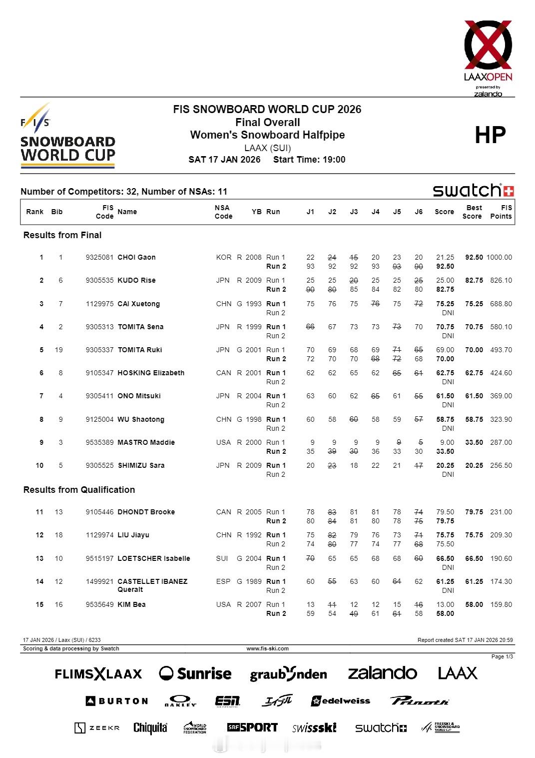 【单板滑雪世界杯蔡雪桐摘铜】国际体坛战报速递 1月17日,单板滑雪世界杯U型池瑞士莱克斯站落幕,中国老将蔡雪桐以75.25分夺得铜牌。韩国小将崔佳温以92.50分的较大优势第三次问鼎世界杯,日本工藤璃星获得亚军。另外一位中国选手武绍桐名列第八。