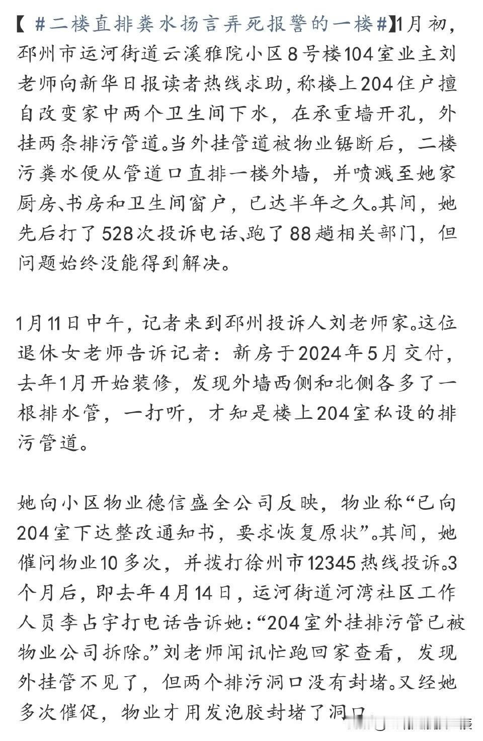 【维权528次跑88趟,竟还遭楼上扬言“弄死你”!】江苏邳州一小区,二楼业主私改管道,粪水直排一楼外墙长达半年。一楼刘老师投诉500多次,楼上竟因不服调解,说出“弄死你”的狠话!虽被行拘,排污照旧。这哪是邻居,简直是“粪霸”!老百姓花一辈子积蓄买个房,却要天天对着粪水瀑布,公理何在?希望有关部门别踢皮球,早点给老实人一个干净的家! 大家说说,如果你遇上这种邻居,该怎么治?