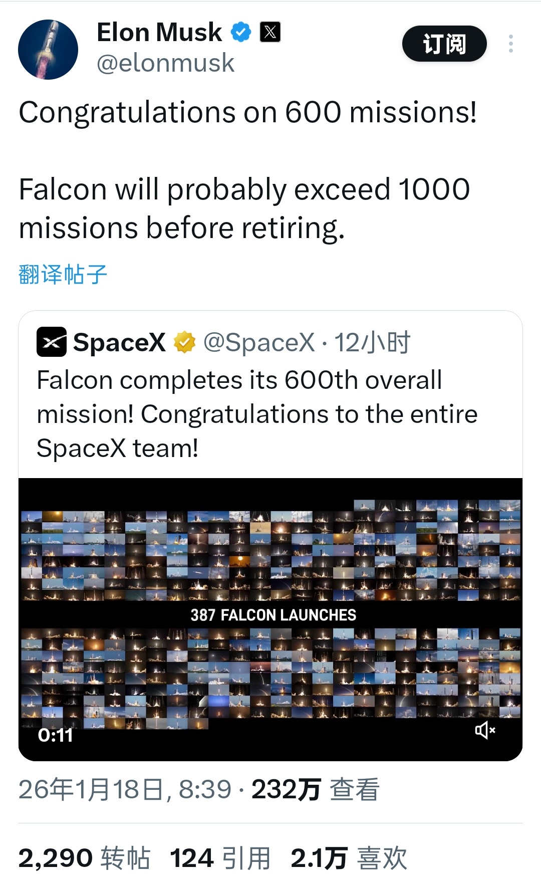 猎鹰火箭完成第600次发射马斯克表示;猎鹰火箭退役前可能会执行超过1000次发射任务。