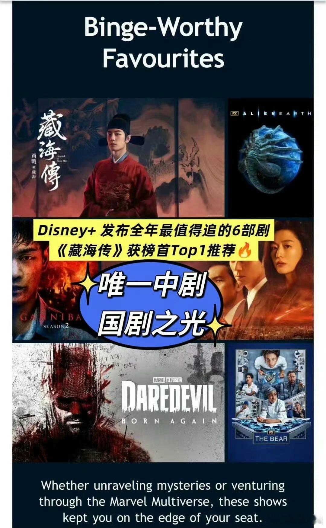 呵呵了,又开始糊弄人了。当别人看不懂有外文字的迪士尼发的这张6部剧是什么意思,就糊弄中国网民?《藏海传》获全年值得追的榜首top1,你瞎营销号还真敢吹,你以为美国人的阅读习惯与你中国人的阅读习惯相同吗?你难道不知最下方、最右边,才是美国人最受重视剧的推荐位吗?这6部剧《藏海传》获推最后一名,第一名是人美国的剧,韩国的剧或第三推荐吧。