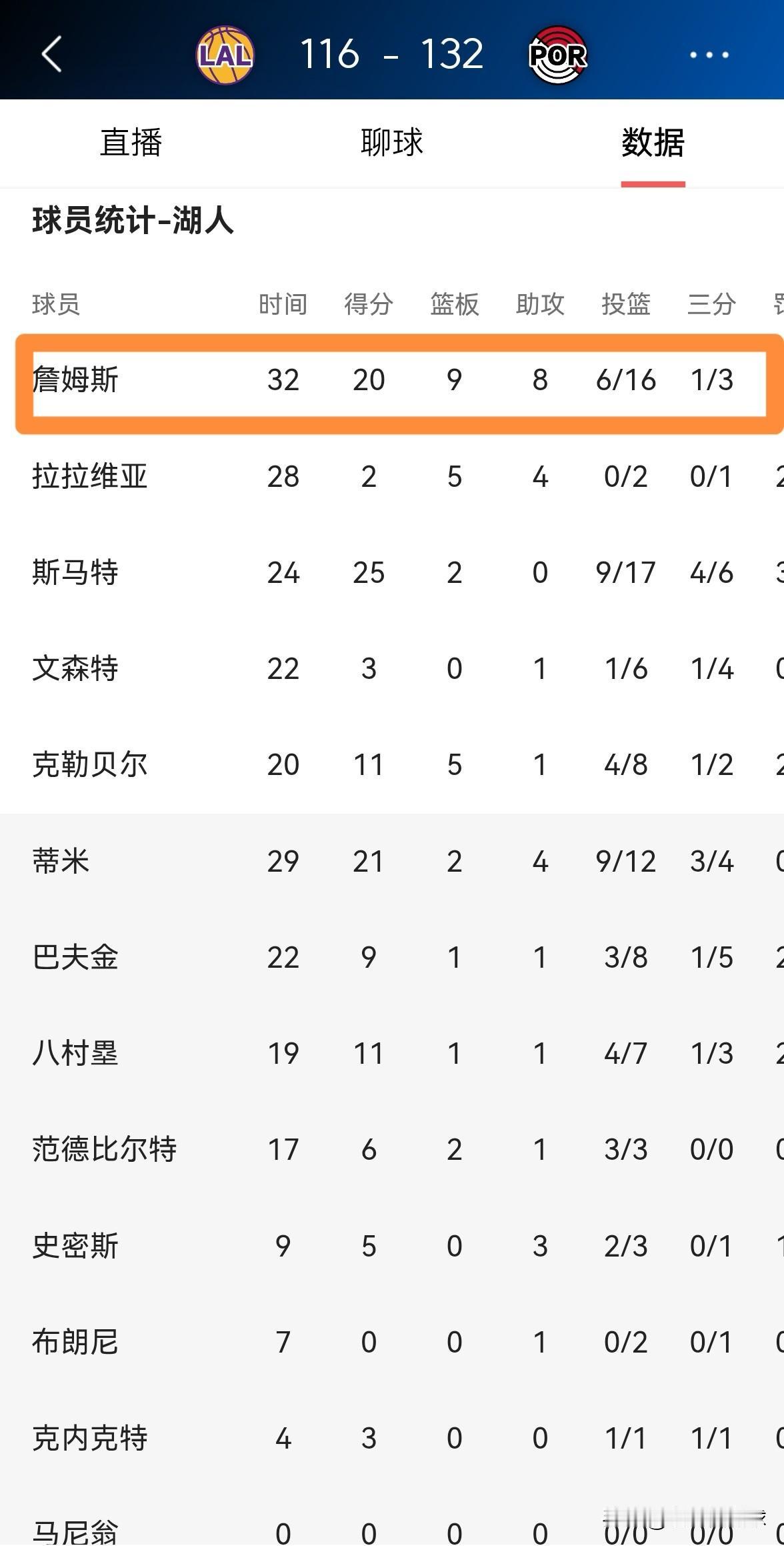 我真的特别佩服湖人巨星詹姆斯的全能!虽然今天湖人在客场以116:132输给了开拓者,但是詹姆斯依然打出了非常全面的表现,他在首发出战的32分钟里,投篮16中6,其中三分球3中1、罚球7中7砍下20分9篮板8助攻1抢断2盖帽,他的场上正负值为-16。 坦白说,本场比赛湖人在缺兵少将的情况下输给开拓者是情理之中的事情,开拓者的主场球迷能够在主场欣赏到詹姆斯的全能表现也算值回了票价。