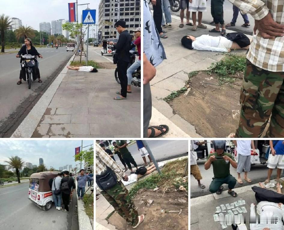 今日清晨,柬甫寨西哈努克港街头发现一名女子躺卧,引起路人关注并报警。警方抵达现场后,对女子随身物品进行清点并拍照留存,以核实身份及情况。 随后,该女子恢复意识,在民众协助下乘嘟嘟车前往医院接受检查。根据现场照片显示的护照信息,该女子大概率为中国籍。