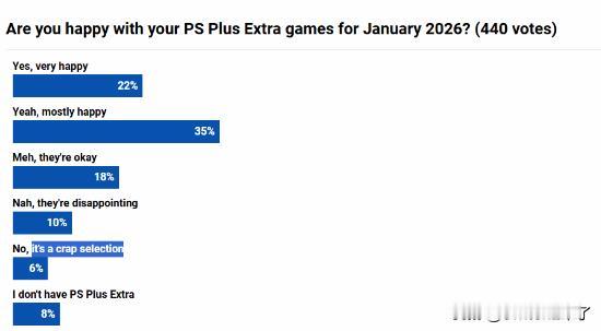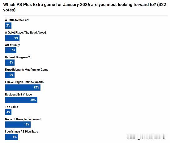 PlayStation Plus游戏库将于1月20日新增数款大作,包括《生化危机8:村庄》《如龙8》《远征:泥泞奔驰游戏》《寂静之地:前方之路》《8号出口》《暗黑地牢2》《向左一点》《山脊赛车》。 该游戏阵容可以说是给索尼这项订阅服务今年开了个好头。日前,外媒pushsquare发起了一项投票,调查玩家对该阵容的满意度,截至发稿,共有440人参与投票:35%基本满意、22%非常满意、18%表示认可、10%感到失望、6%认为非常垃圾。游戏方面,《如龙8》成为了最受欢迎的作品。