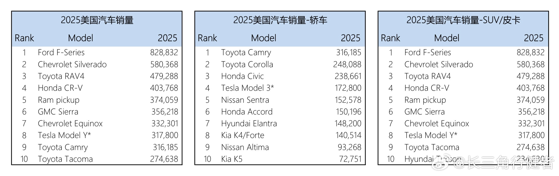 美丽国最畅销的十大车型、十大轿车、十大SUV/皮卡。在轿车领域,Model3排