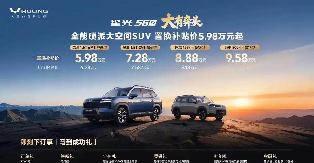 5.98万元起!五菱全能硬派SUV星光560正式上市! 2025年,五菱总产值再次突破了1000亿元,同比增长24%;新能源汽车销量第一次突破100万辆大关,同比增长31.9%,持续领跑行业。 其中五菱宏光MINIEV家族连续65个月蝉联A00级新能源汽车销量第一,累计销量突破185万辆,成为中国品牌纯电市场销量最高的单一车型。 在品牌坚实的市场基础与用户口碑之上,星光560的上市为五菱注入了新的活力。 新车融合硬派美学设计、领先同级的宽适空间、覆盖燃油、插混与纯电的“一车三动力”选择和军工级安全品质,星光560满足了用户对于多场景、高质价比出行的期待,让生活大有奔头。