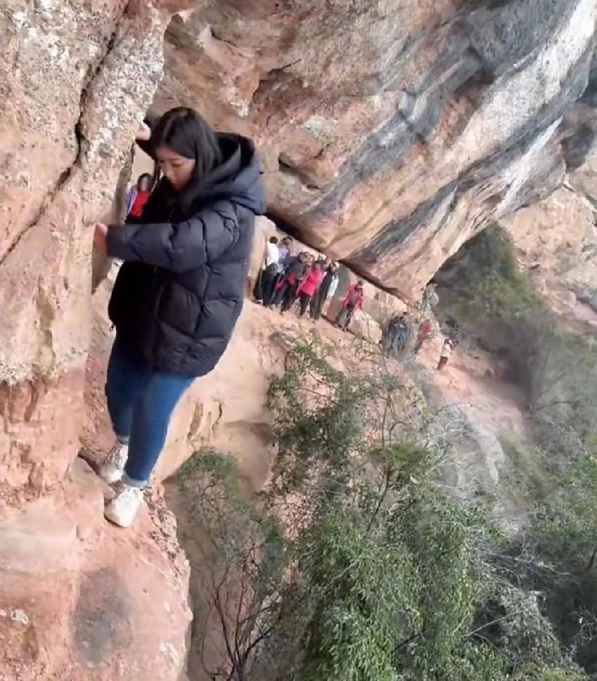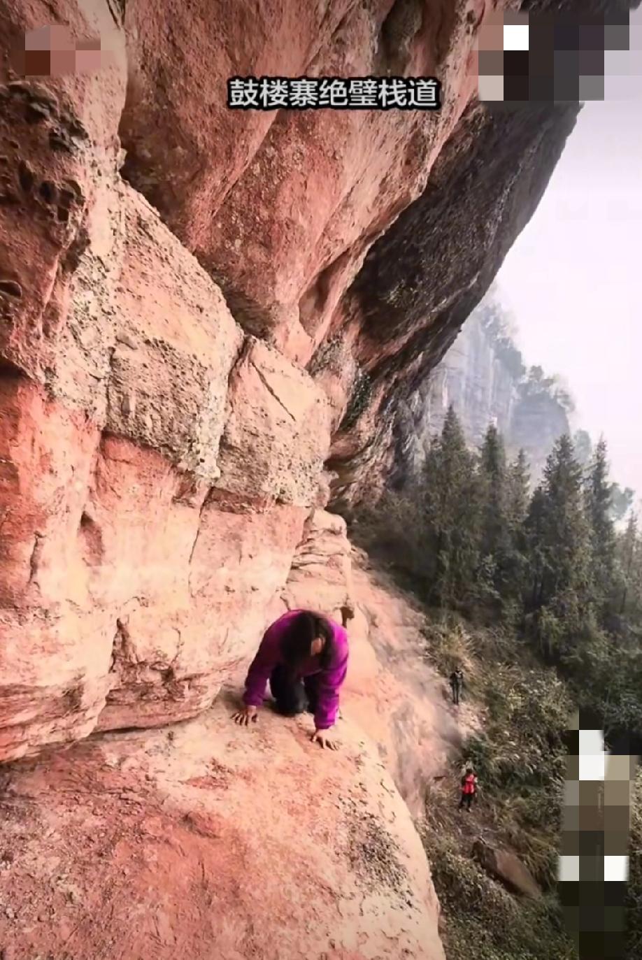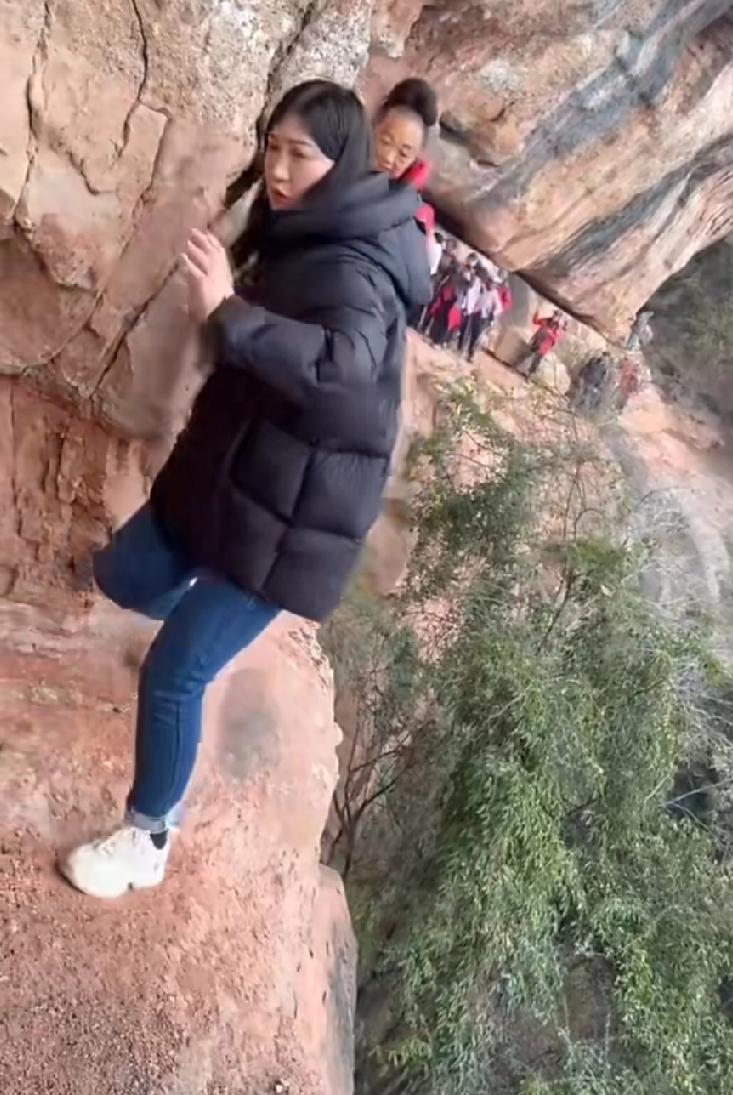 一绝壁古栈道,女子身着臃肿的羽绒服,脚蹬估计有10多公分的增高鞋行走在悬崖峭壁边,下面就是20多米高的深渊。不要说她自己了,镜头前的我们看到这一幕,这颗心也是一直提在嗓子眼的! 发觉这批人当中,绝大部分都是大爷大妈,我猜他们在外面坐公共交通都是要年轻人让座的,怎么到了这么危险的悬崖峭壁边上,身手又如此矫健了呢?