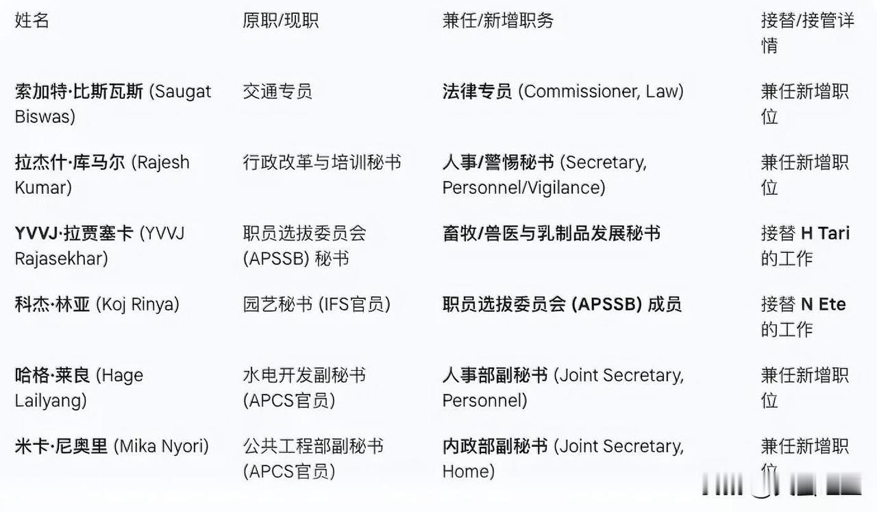【藏南政情】 藏南现状 藏南印控区 藏南冲突 近日藏南地区进行了人事调整。根据1月16日由伪首席秘书马尼什·库马尔·古普塔(Manish Kumar Gupta)发布的“指令”,“藏南伪政府”进行了一系列人事调整,具体情况见图表。 ​​​