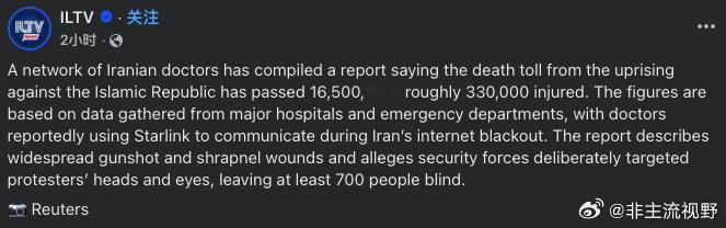 过去的三周,伊朗人到底遭受了多大的伤亡?这是一组新数据,一群由伊朗医生组成的网络小组编写了一份报告,数据显示,死亡人数已经超过16500人,受伤的大约是330000人,数据基于从主要医院和急诊科收集的信息。