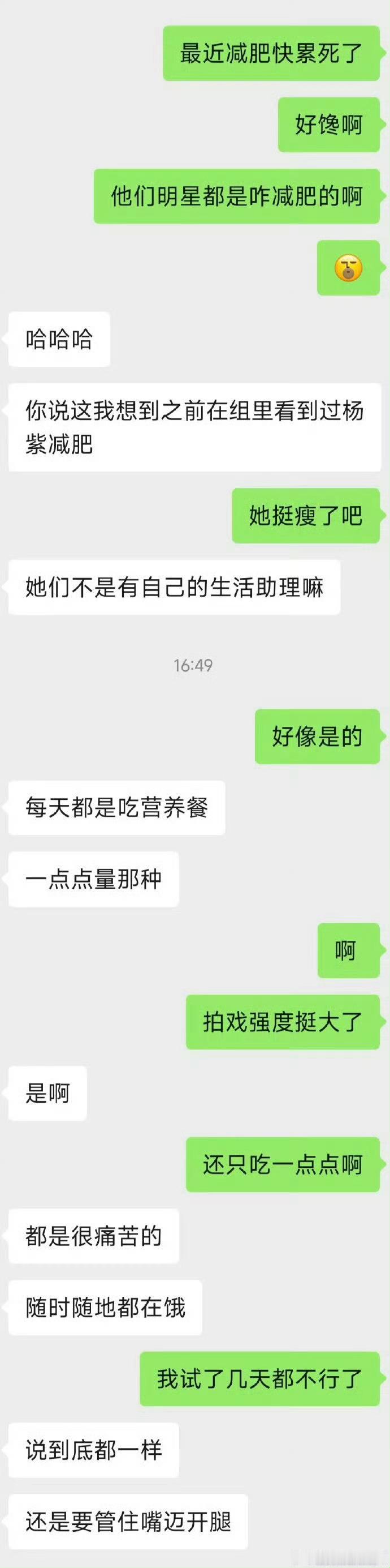 曝杨紫每天都在很痛苦地减肥“杨紫每天都在很痛苦地减肥”的聊天记录。实际上,这是剧组工作人员在称赞她拍戏敬业,折射出演员行业普遍的身材压力。镜头对体型的要求,往往让演员在现实中必须极度纤瘦。