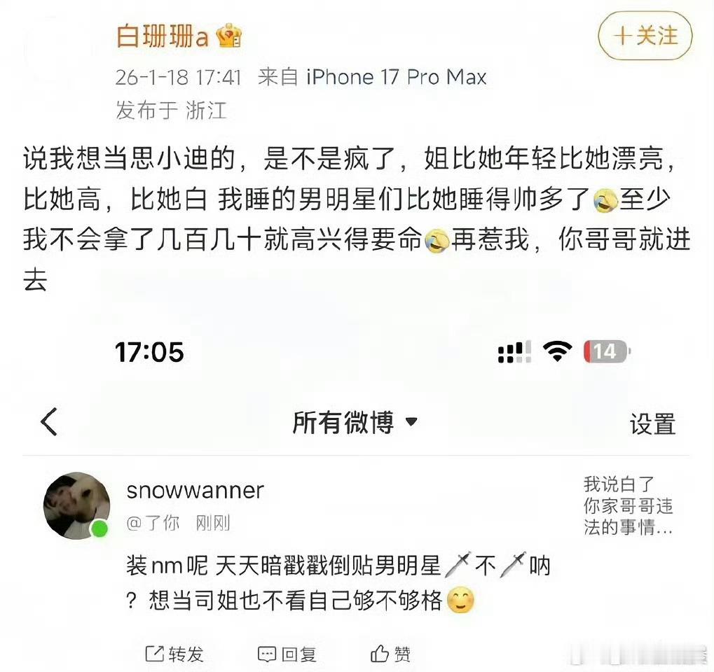 白珊珊喊话吴磊,看下来好像是司晓迪升级版白珊珊发文回应说她比司晓迪漂亮年轻,自己s的男明星更多更帅,这年头pc和被p是什么上的了台面的东西吗?白珊珊 吴磊你欠我的拿什么还