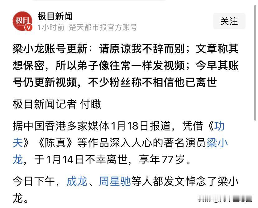 吃晚饭的时候,听到梁小龙去世的消息。我问父亲,为什么梁小龙去世4天媒体才得知消息,父亲说了一句话,一下子就戳中了我的心窝。他说,这才是他的低调和体面。 现在娱乐圈有多少明星身,把后事搞得沸沸扬扬,可梁小龙家人先悄悄处理好后事,再对外公布,这份克制和尊重,真的太难得了。 前几天还刷到他为失踪孩童发声的视频,他穿了蓝西装白裤子,在视频里字字恳切呼吁重判人贩子,谁能想到那竟是他留给大家的最后念想。 账号后续更新是他的关门弟子操作的,本来想保密,可这份未竟的善意,比任何告别都戳人。 提起梁小龙,谁的DNA没动?是《霍元甲》里一脚踢碎“东亚病夫”牌匾的陈真,眼神里的热血和硬气,成了几代人的集体记忆;也是《功夫》里喊着“天下武功唯快不破”的火云邪神,疯癫又通透,让人过目不忘, 4天的延迟官宣,没有热搜轰炸,没有话题炒作,只给逝者和家人留足私密空间。这不仅是体面,更是梁小龙一生风骨的延续——生前爱国敢言,身后低调从容。 这样的老戏骨,值得所有人缅怀。 你是从“陈真”还是“火云邪神”开始认识梁小龙的?来评论区说说你的童年记忆吧!