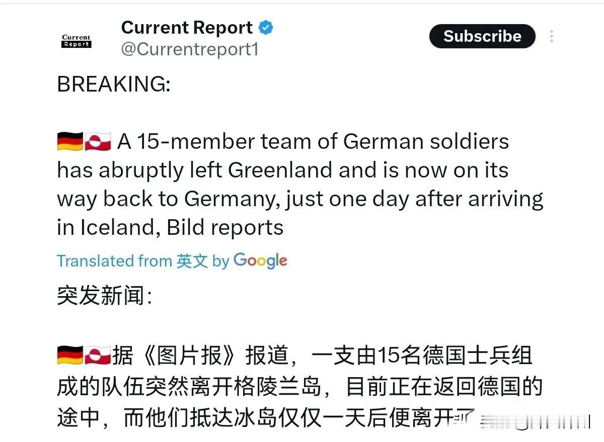 德国撤兵了,面对特朗普的压力,德国一天都没有坚持住!特朗普刚宣布要对欧洲八国加关税,不到24小时,德国就宣布撤军了!1月18日,根据德国图片报报道,一支由15名士兵组成的德国小分队在抵达冰岛仅一天后,便突然宣布撤离格陵兰岛,目前正启程返回德国。说实话,德国如此快宣布撤军,这真是让人咋舌。 评几句: 德国这波操作简直刷新退让的速度!15名士兵刚抵达格陵兰岛,还没站稳脚跟,就因特朗普的关税威胁火速撤离,全程不到24小时,连句立场声明都未发布,着实让人咋舌。 一边是特朗普刚宣布对欧洲八国加征关税,税率最高将达25%,另一边德国就用撤军服软,把“盟友协作”的表态抛到九霄云外。要知道,美国是德国最重要的出口市场之一,据相关经济模型测算,关税落地可能让德国经济损失超千亿欧元,汽车等支柱产业更是首当其冲,但如此毫无抵抗的仓促撤军,也凸显出欧洲大国在美欧博弈中的两难处境。 反观丹麦硬怼美国威胁“不可接受”,法国喊着“捍卫欧洲主权”,德国却用实际行动选择妥协。嘴上喊着推进欧洲一体化、实现防务自主,可面对美国的压力,连一天都坚持不住。这种趋利避害的短视操作,不仅暴露了对美国的经济依赖,更让欧洲的团结愿景遭遇现实冲击。再这样下去,欧洲只会在美欧博弈中愈发被动,所谓的自主安全也将沦为难以实现的空谈。