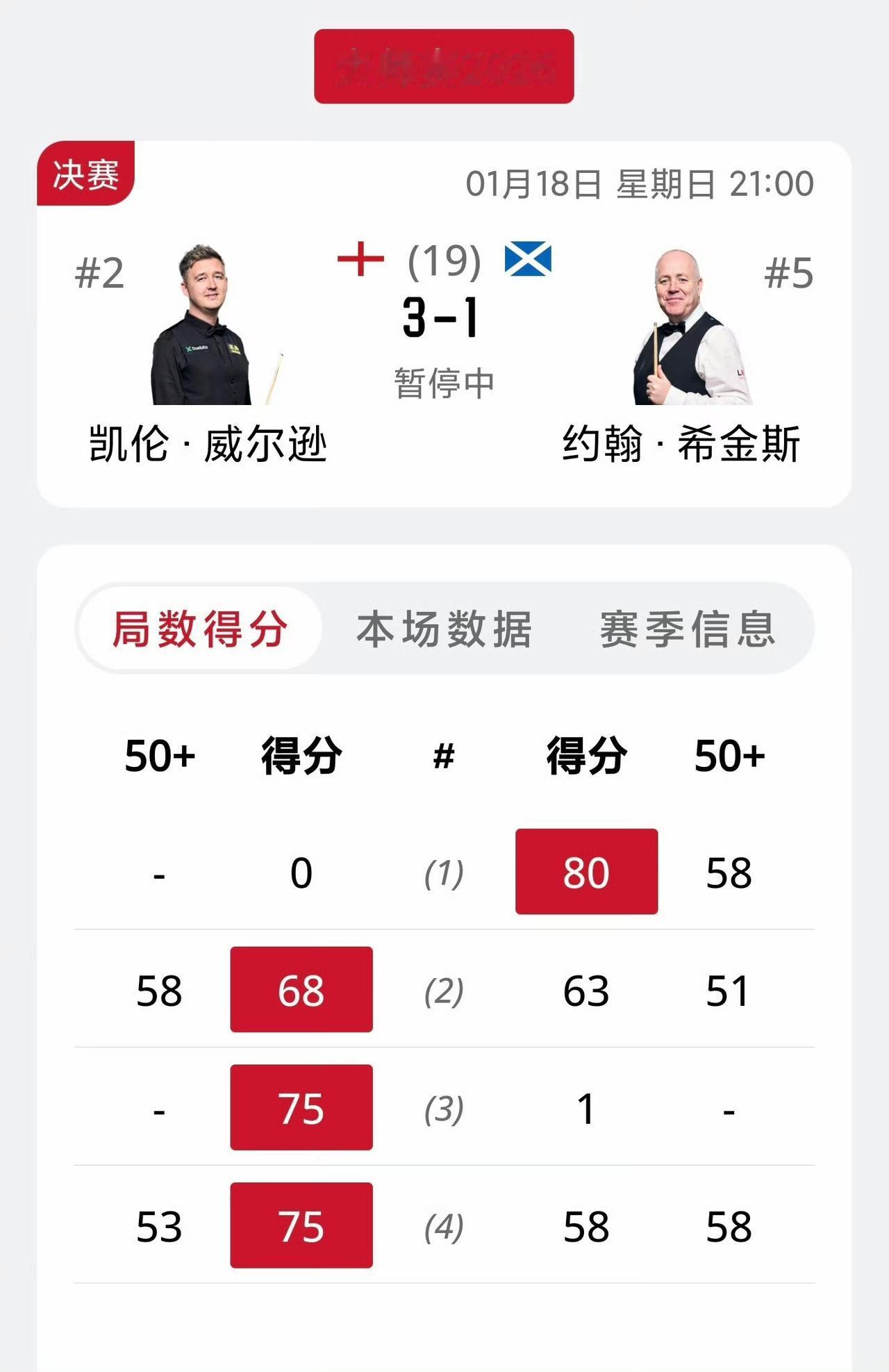 巫师危矣!2026斯诺克大师赛决赛前4局,希金斯在拿下首局后,两次遭遇单局逆转,1-3落后囧哥进入中场休息…… 希金斯本该3-1领先,两个袋口不进,希望不要影响心态。 不过希金斯什么大风大浪没见过,只要比赛还没结束,手感迟早会来。