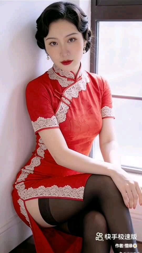 徐小翠着酒红丝绸绣花紧身旗袍,金丝绣纹雅致,立北京红墙前,黑发垂肩,玉骨冰肌胜雪