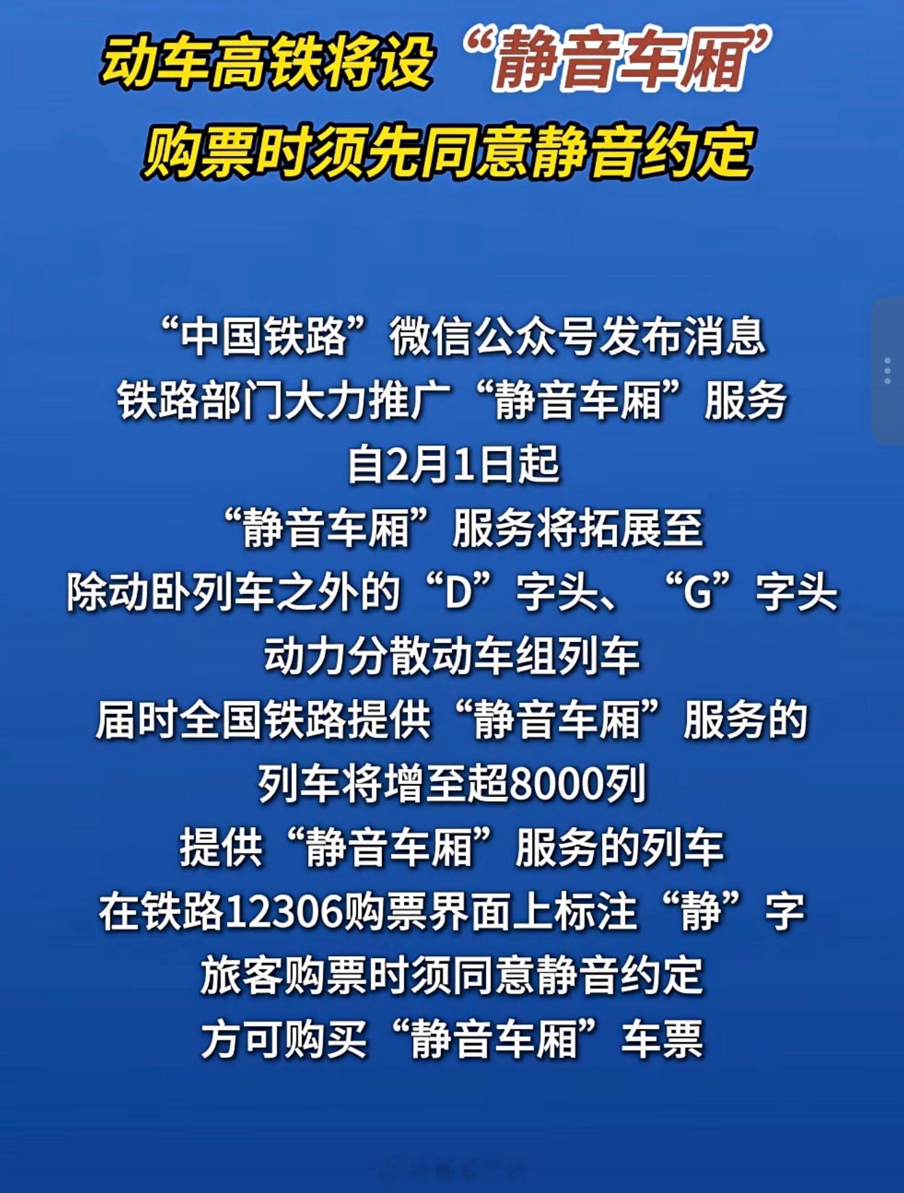 动车高铁将迎来“静音车厢”,旅客购买时需同意静音约定,特别好,铁路部门还是真的有在做实时的。以后不买商务座也有机会安静睡觉了,坐高铁动车真的受不了大声讲电话和手机刷视频外放的人,出差人群伤不起,睡眠太少了。